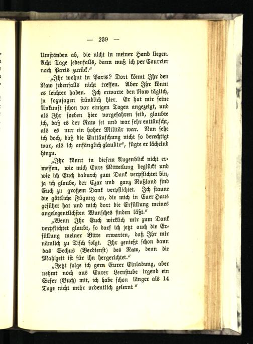 „Wenn Ihr Euch wirklich mir zum Dank verpflichtet glaubt, so darf ich jetzt auch die Erfüllung meiner Bitte erwarten, daß Ihr mir nämlich zu Tisch folgt. Ihr genießt schon dann das Sechus (Verdienst) des Raw, denn die Mahlzeit ist für ihn hergerichtet."