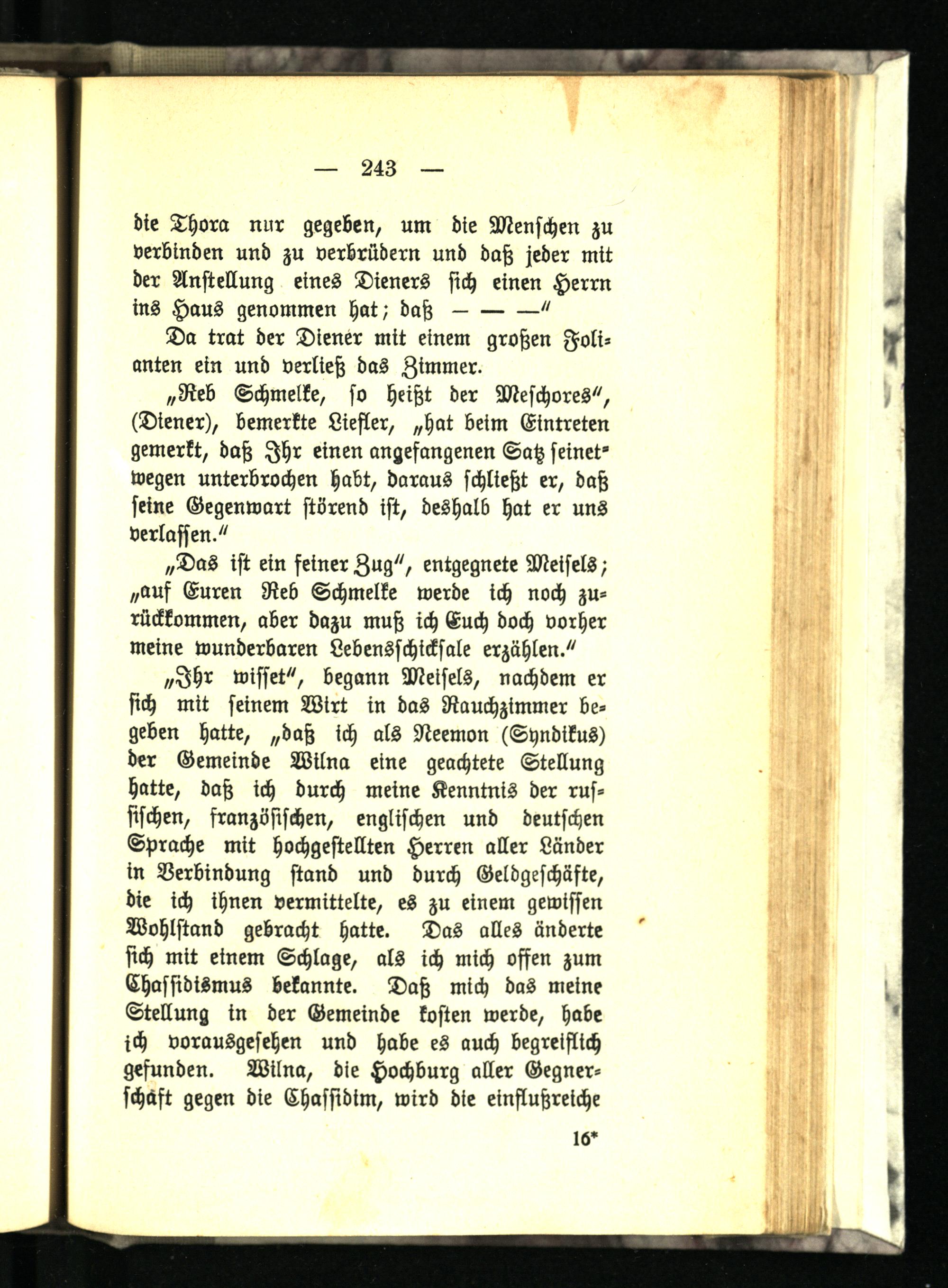 „Ihr wisset", begann Meisels, nachdem er sich mit seinem Wirt in das Rauchzimmer begeben hatte, „daß ich als Neemon (Syndikus) der Gemeinde Wilna eine geachtete Stellung hatte, daß ich durch meine Kenntnis der russischen, französischen, englischen und deutschen Sprache mit hochgestellten Herren aller Länder in Verbindung stand und durch Geldgeschäfte, die ich ihnen vermittelte, es zu einem gewissen Wohlstand gebracht hatte. Das alles änderte sich mit einem Schlage, als ich mich offen zum Chassidismus bekannte. Daß mich das meine Stellung in der Gemeinde kosten werde, habe ich vorausgesehen und habe es auch begreiflich gefunden. Wilna, die Hochburg aller Gegnerschüft gegen die Chassidim, wird die einflußreiche