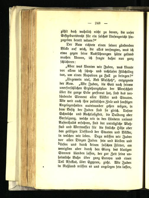 „Ungemein viel, Reb Moscheh", entgegnete der Raw. „Wir Juden, die Gott nach seinem unerforschlichen Erziehungsplan der Menschheit über die ganze Erde zerstreut hat, sind das verbindende Element aller Völker und Staaten. Wie wett auch ihre politischen Ziele und sonstigen Angelegenheiten auseinander gehen mögen, in dem Besitz der Juden sind sie gleich. Unsere Schwäche und Rechtlosigkeit, die Duldung oder Verfolgung, welche wir in den Ländern unseres Aufenthalts erfahren, sind der untrügliche Maßstab und Wertmesser für die sittliche Höhe oder den geistigen Tiefstand der Staaten und Völker, in welchen wir leben. Dazu müssen wir Juden vor allen Dingen Juden sein und bleiben und dürfen uns durch keinen falschen Flitter, am wenigsten aber durch den Glanz des blutigen Sternes blenden lassen, der zur Zeit seine unheimliche Bahn über ganz Europa und einen Teil Afrikas, über Egypten, zieht. Wir Juden in Rußland müssen es uns angelegen sein lassen,