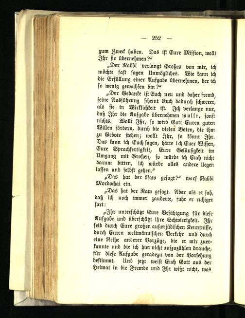 „Ihr unterschätzt Eure Befähigung für diese Aufgabe und überschätzt ihre Schwierigkeit. Ihr seid durch Eure großen außerjüdischen Kenntnisse, durch Euren weltmännischen Verkehr und durch eine Reihe anderer Vorzüge, die er mir zuerkannte nnd die ich hier nicht aufzuzählen brauche, für diese Aufgabe geradezu von der Vorsehung bestimmt. Und jetzt weist Euch Gott aus der Heimat in die Fremde und Ihr wißt nicht, was
