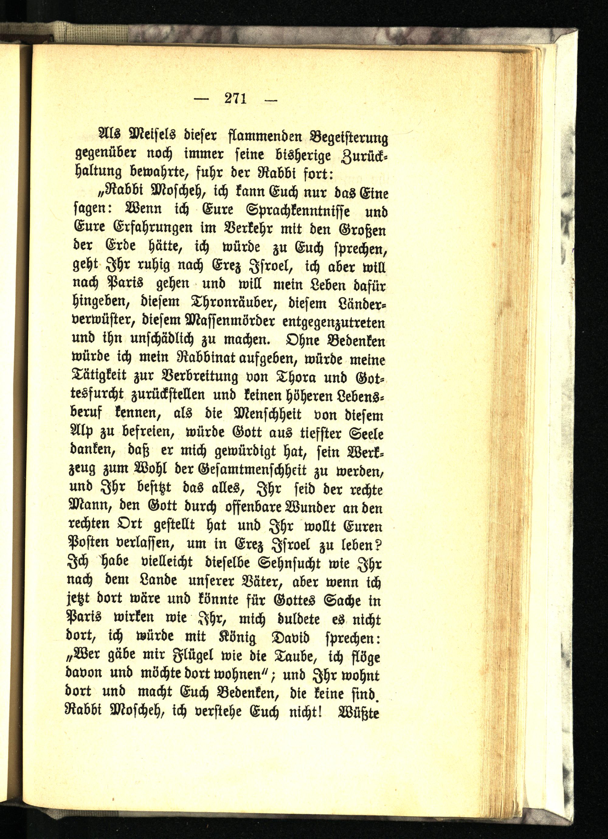 „Rabbi Moscheh, ich kann Euch nur das Eine sagen: Wenn ich Eure Sprachkenntnifse und Eure Erfahrungen im Verkehr mit den Großen der Erde hätte, ich würde zu Euch sprechen, geht Ihr ruhig nach Erez Israel, ich aber will nach Paris gehen und will mein Leben dafür hingeben, diesem Thronräuber, diesem Länder- verwüster, diesem Massenmörder entgegenzutreten und ihn unschädlich zu machen. Ohne Bedenken würde ich mein Rabbinat aufgeben, würde meine Tätigkeit zur Verbreitung von Thora und Gottesfurcht zurückstellen und keinen höheren Lebensberuf kennen, als die Menschheit von diesem Alp zu befreien, würde Gott aus tiefster Seele danken, daß er mich gewürdigt hat, sein Werkzeug zum Wohl der Gesamtmenschhnt zu werden/ und Ihr besitzt das alles, Ihr seid der rechte Mann, den Gott durch offenbare Wunder an den rechten Ort gestellt hat und Ihr wollt Euren Posten verlaßen, um in Erez Israel zu leben? Ich habe vielleicht dieselbe Sehnsucht wie Ihr nach dem Lande unserer Väter, aber wenn ich jetzt dort wäre und könnte für Gottes Sache in Paris wirken wie Ihr, mich duldete es nicht dort, ich würde mit König David sprechen: „Wer gäbe mir Flügel wie die Taube, ich flöge davon und möchte dort wohnen" - und Ihr wohnt dort und macht Euch Bedenken, die keine sind. Rabbi Moscheh, ich verstehe Euch nicht! Wüßte