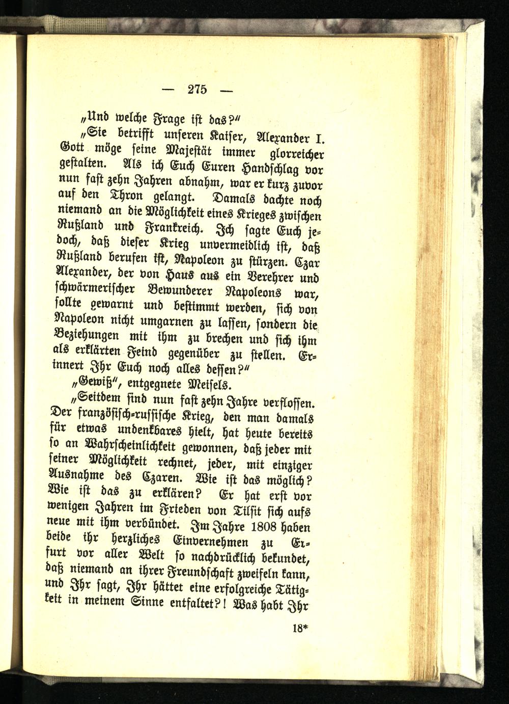 „Seitdem sind nun fast zehn Jahre verflossen. Der französisch-russische Krieg, den man damals für etwas undenkbares hielt, hat heute bereits so an Wahrscheinlichkeit gewonnen, daß jeder mit seiner Möglichkeit rechnet, jeder, mit einziger Ausnahme des Czaren. Wie ist das möglich? Wie ist das zu erklären? Er hat erst vor wenigen Jahren im Frieden von Tilsit sich aufs neue mit ihm verbündet. Im Jahre 1808 haben beide ihr herzliches Einvernehmen zu Erfurt vor aller Welt so nachdrücklich bekundet, daß niemand an ihrer Freundschaft zweifeln kann, und Ihr sagt, Ihr hättet eine erfolgreiche Tätigkeit in meinem Sinne entfaltet? I Was habt Ihr