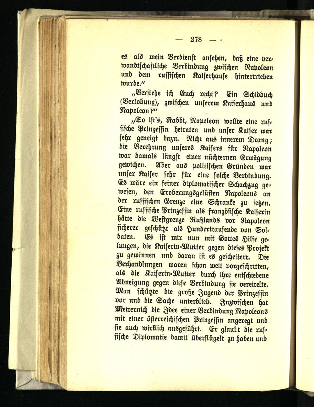 „So ist's, Rabbi, Napoleon wollte eine russische Prinzessin heiraten und unser Kaiser war sehr geneigt dazu. Nicht aus innerem Drang; die Verehrung unseres Kaisers für Napoleon war damals längst einer nüchternen Erwägung gewichen. Aber aus politischen Gründen war unser Kaiser sehr für eine solche Verbindung. Es wäre ein feiner diplomatischer Schachzug gewesen, den Eroberungsgelüsten Napoleons an der russischen Grenze eine Schranke zu setzen. Eine russische Prinzessin als französische Kaiserin hätte die Westgrenze Rußlands vor Napoleon sicherer geschützt als Hunderttausende von Soldaten. Es ist mir nun mit Gottes Hilfe gelungen, die Kaiserin-Mutter gegen dieses Projekt zu gewinnen und daran ist es gescheitert. Die Verhandlungen waren schon weit vorgeschritten, als die Kaiserin-Mutter durch ihre entschiedene Abneigung gegen diese Verbindung sie vereitelte. Man schützte die große Jugend der Prinzessin vor und die Sache unterblieb. Inzwischen hat Metternich die Idee einer Verbindung Napoleons mit einer österreichischen Prinzessin angeregt und sie auch wirklich ausgeführt. Er glaubt die russische Diplomatie damit überflügelt zu haben und