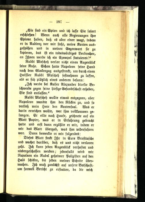 Rabbi Moscheh verlor nicht einen Augenblick seine Ruhe. Schon hatte Napoleon seine Hand nach dem Glockenzug ausgestreckt, um durch einen Huissier Rabbi Moscheh festnehmen zu lassen, als er sich plötzlich eines anderen besann: