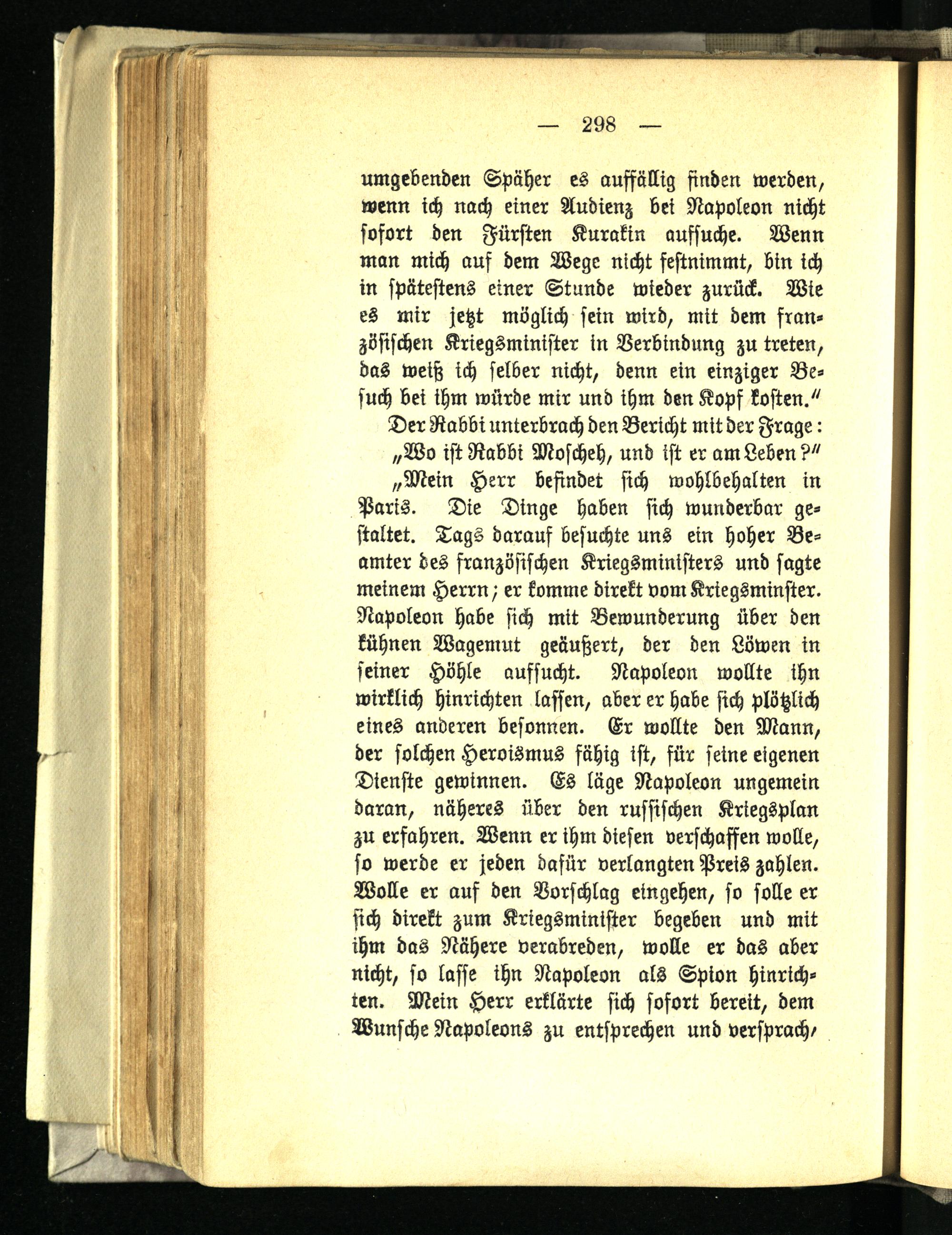 „Mein Herr befindet sich wohlbehalten in Paris. Die Dinge haben sich wunderbar gestaltet. Tags darauf besuchte uns ein hoher Beamter des französischen Kriegsministers und sagte meinem Herrn / er komme direkt vom Kriegsminster. Napoleon habe sich mit Bewunderung über den kühnen Wagemut geäußert, der den Löwen in seiner Höhle aufsucht. Napoleon wollte ihn wirklich hinrichten lassen, aber er habe sich plötzlich eines anderen besonnen. Er wollte den Mann, der solchen Heroismus fähig ist, für seine eigenen Dienste gewinnen. Es läge Napoleon ungemein daran, näheres über den russischen Kriegsplan zu erfahren. Wenn er ihm diesen verschaffen wolle, so werde er jeden dafür verlangten Preis zahlen. Wolle er auf den Vorschlag eingehen, so solle er sich direkt zum Kriegsminister begeben und mit ihm das Nähere verabreden, wolle er das aber nicht, so lasse ihn Napoleon als Spion hinrtch- ten. Mein Herr erklärte sich sofort bereit, dem Wunsche Napoleons zu entsprechen und versprach,