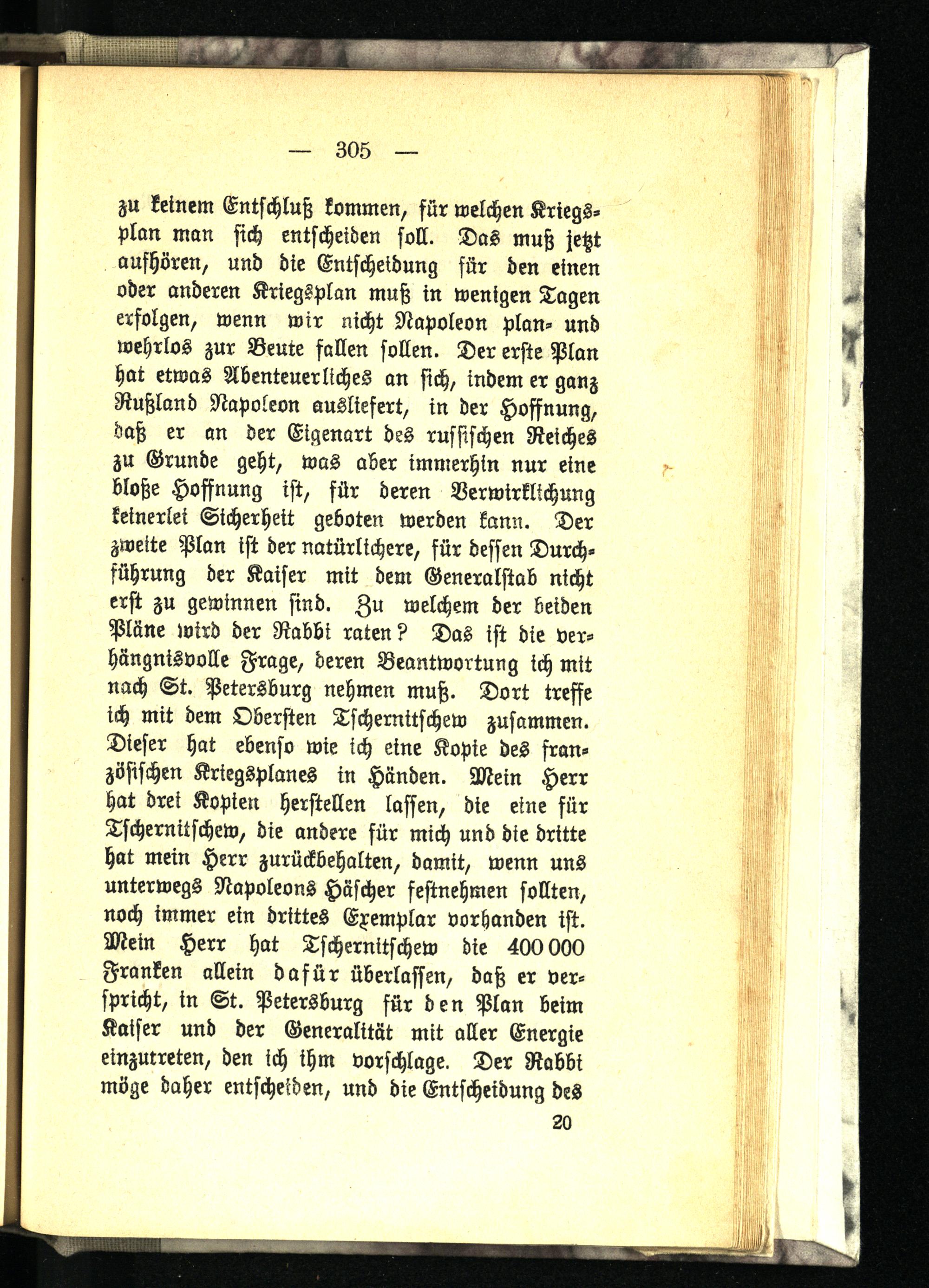 zu keinem Entschluß kommen, für welchen Kriegsplan man sich entscheiden soll- Das muß jetzt aufhören, und die Entscheidung für den einen oder anderen Kriegsplan muß in wenigen Tagen erfolgen, wenn wir nicht Napoleon plan- und wehrlos zur Beute fallen sollen. Der erste Plan hat etwas Abenteuerliches an sich, indem er ganz Rußland Napoleon ausliefert, in der Hoffnung, daß er an der Eigenart des russischen Reiches zu Grunde geht, was aber immerhin nur eine bloße Hoffnung ist, für deren Verwirklichung keinerlei Sicherheit geboten werden kann. Der zweite Plan ist der natürlichere, für dessen Durchführung der Kaiser mit dem Generalstab nicht erst zu gewinnen sind. Zu welchem der beiden Pläne wird der Rabbi raten? Das ist die verhängnisvolle Frage, deren Beantwortung ich mit nach St. Petersburg nehmen muß. Dort treffe ich mit dem Obersten Tschernitschew zusammen. Dieser hat ebenso wie ich eine Kopie des französischen Kriegsplanes in Händen. Mein Herr hat drei Kopien Herstellen lassen, die eine für Tschernitschew, die andere für mich und die dritte hat mein Herr zurückbehalten, damit, wenn uns unterwegs Napoleons Häscher festnehmen sollten, noch immer ein drittes Exemplar vorhanden ist. Mein Herr hat Tschernitschew die 400000 Franken allein dafür überlassen, daß er verspricht, in St. Petersburg für den Plan beim Kaiser und der Generalität mit aller Energie einzutreten, den ich ihm Vorschläge. Der Rabbi möge daher entscheiden, und die Entscheidung des