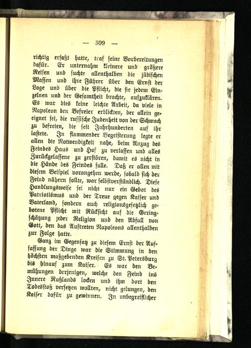Reisen und suchte allenthalben die jüdischen Massen und ihre Führer über den Ernst der Lage und über die Pflicht, die sie jedem Einzelnen und der Gesamtheit brachte, aufzuklären. Es war dies keine leichte Arbeit, da viele in Napoleon den Befreier erblickten, der allein geeignet sei, die russische Judenheit von der Schmach zu befreien, die seit Jahrhunderten auf ihr lastete. In flammender Begeisterung legte er allen die Notwendigkeit nahe, beim Anzug des Feindes Haus und Hof zu verlassen und alles Zurückgelassene zu zerstören, damit es nicht in die Hände des Feindes falle. Daß er allen mit diesem Beispiel vorangehen werde, sobald sich der Feind nähern sollte, war selbstverständlich. Diese Handlungsweise sei nicht nur ein Gebot des Patriotismus und der Treue gegen Kaiser und Vaterland, sondern auch religionsgesetzlich gebotene Pflicht mit Rücksicht auf die Geringschätzung jeder Religion und den Abfall von Gott, den das Auftreten Napoleons allenthalben zur Folge hatte.