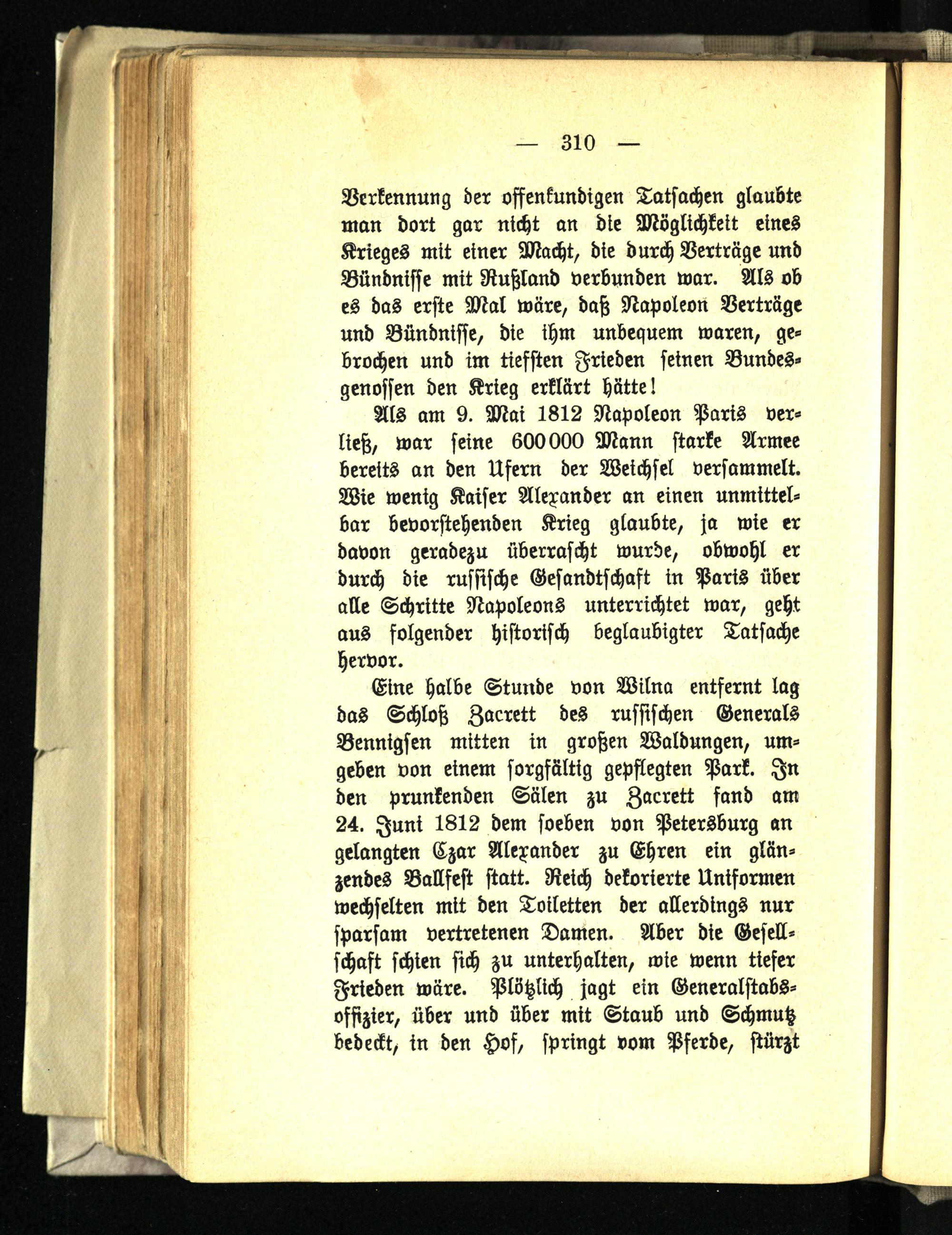 Eine halbe Stunde von Wilna entfernt lag das Schloß Zacrett des russischen Generals Bennigsen mitten in großen Waldungen, umgeben von einem sorgfältig gepflegten Park. In den prunkenden Sälen zu Zacrett fand am 24. Juni 1812 dem soeben von Petersburg an gelangten Czar Alexander zu Ehren ein glänzendes Ballfest statt. Reich dekorierte Uniformen wechselten mit den Toiletten der allerdings nur sparsam vertretenen Damen. Aber die Gesellschaft schien sich zu unterhalten, wie wenn tiefer Frieden wäre. Plötzlich jagt ein Generalstabsoffizier, über und über mit Staub und Schmutz bedeckt, in den Hof, springt vom Pferde, stürzt