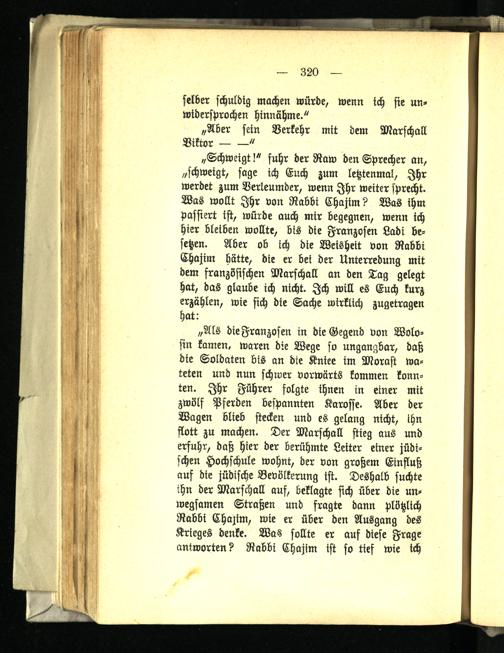„Als dieFranzosen in die Gegend von Wolo- sin kamen, waren die Wege so ungangbar, daß die Soldaten bis an die Kniee im Morast wateten und nun schwer vorwärts kommen konnten. Ihr Führer folgte ihnen in einer mit zwölf Pferden bespannten Karosse. Aber der Wagen blieb stecken und es gelang nicht, ihn flott zu machen. Der Marschall stieg aus und erfuhr, daß hier der berühmte Leiter einer jüdischen Hochschule wohnt, der von großem Einfluß auf die jüdische Bevölkerung ist. Deshalb suchte ihn der Marschall auf, beklagte sich über die unwegsamen Straßen und fragte dann Plötzlich Rabbi Chasim, wie er über den Ausgang des Krieges denke. Was sollte er auf diese Frage antworten? Rabbi Chajim ist so tief wie ich