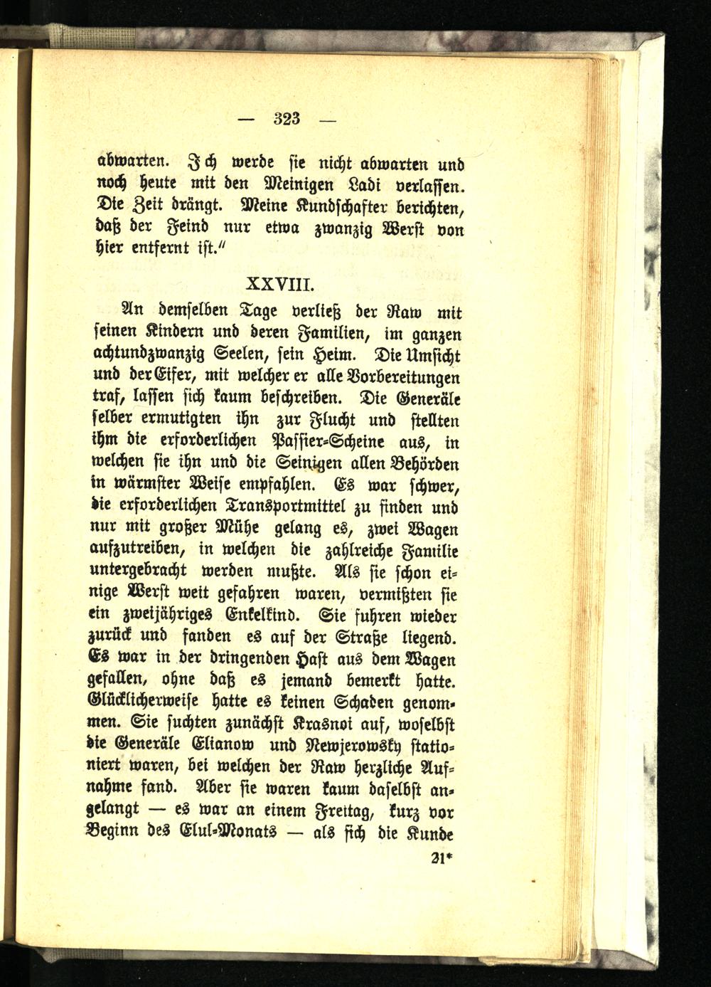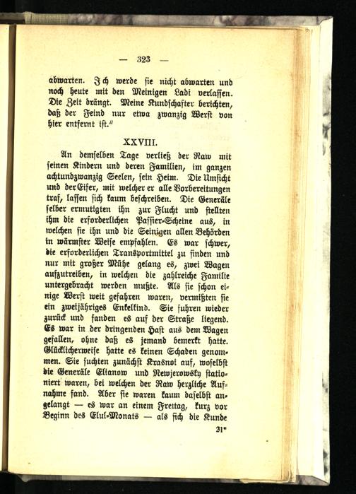 An demselben Tage verließ der Raw mit seinen Kindern und deren Familien, im ganzen achtundzwanzig Seelen, sein Heim. Die Umsicht und der Eifer, mit weicherer alle Vorbereitungen traf, lassen sich kaum beschreiben. Die Generäle selber ermutigten ihn zur Flucht und stellten ihm die erforderlichen Passier-Scheine aus, in welchen sie ihn und die Seinigen allen Behörden in wärmster Weise empfahlen. Es war schwer, die erforderlichen Transportmittel zu finden und nur mit großer Mühe gelang es, zwei Wagen aufzutreiben, in welchen die zahlreiche Familie untergebracht werden mußte. Als sie schon einige Werst weit gefahren waren, vermißten sie ein zweijähriges Enkelkind. Sie fuhren wieder zurück und fanden es auf der Straße liegend. Es war in -er dringenden Hast aus dem Wagen gefallen, ohne daß es jemand bemerkt hatte. Glücklicherweise hatte es keinen Schaden genommen. Sie suchten zunächst Krasnoi auf, woselbst die Generäle Elianow und Newjerowsky stationiert waren, bei welchen der Raw herzliche Aufnahme fand. Aber sie waren kaum daselbst angelangt — es war an einem Freitag, kurz vor Beginn des Elul-Monats — als sich die Kunde