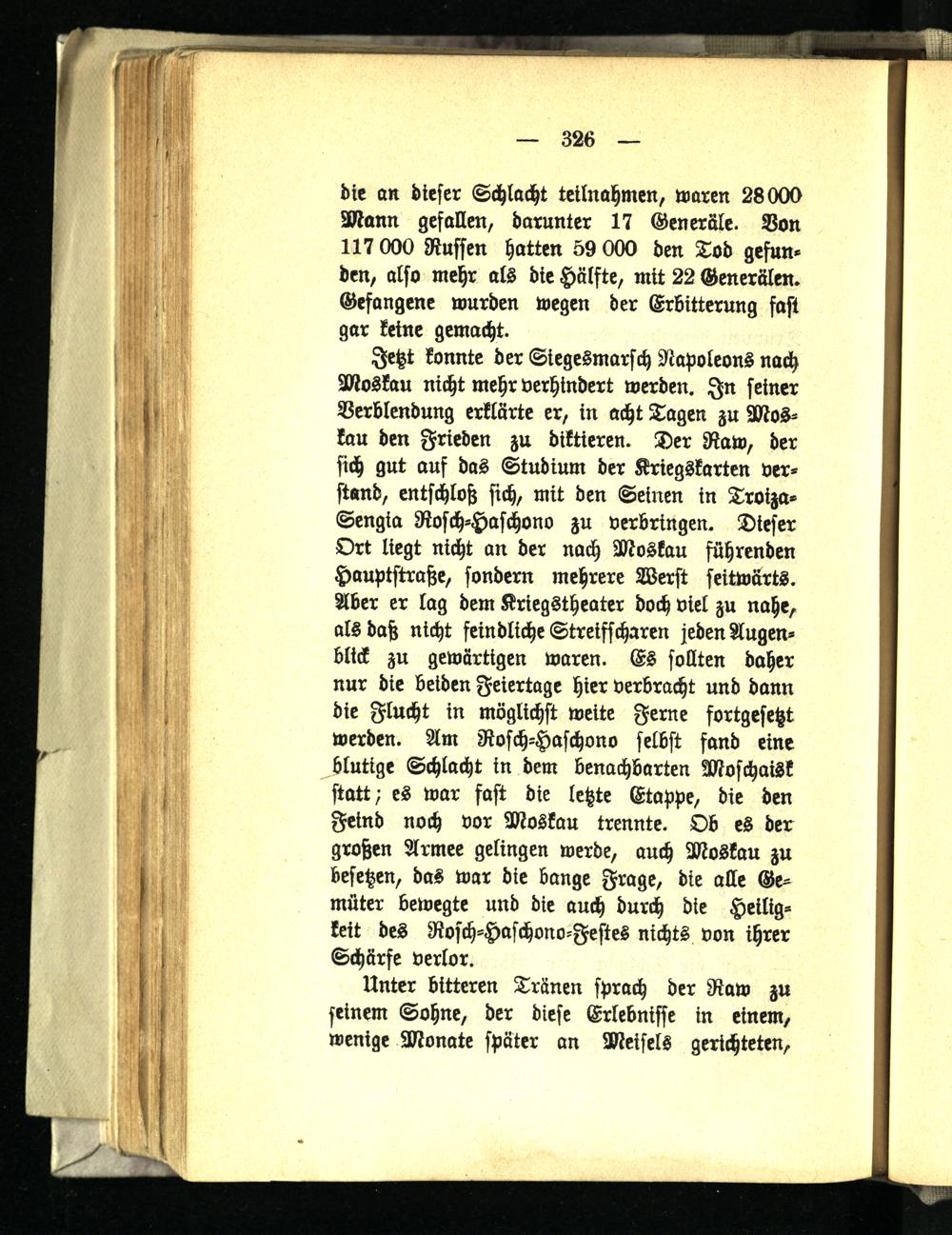 Jetzt konnte der Siegesmarsch Napoleons nach Moskau nicht mehr verhindert werden. In seiner Verblendung erklärte er, in acht Tagen zu Moskau den Frieden zu diktieren. Der Raw, der sich gut auf das Studium der Kriegskarten verstand, entschloß sich, mit den Seinen in Troiza- Sengia Rosch-Haschono zu verbringen. Dieser Ort liegt nicht an der nach Moskau führenden Hauptstraße, sondern mehrere Werst seitwärts. Aber er lag dem Kriegstheater doch viel zu nahe, als daß nicht feindliche Streifscharen jeden Augenblick zu gewärtigen waren. Es sollten daher nur die beiden Feiertage hier verbracht und dann die Flucht in möglichst weite Ferne fortgesetzt werden. Am Rosch-Haschono selbst fand eine blutige Schlacht in dem benachbarten Moschaisk statt- es war fast die letzte Etappe, die den Feind noch vor Moskau trennte. Ob es der großen Armee gelingen werde, auch Moskau zu besetzen, das war die bange Frage, die alle Gemüter bewegte und die auch durch die Heiligkeit des Rosch-Haschono-Festes nichts von ihrer Schärfe verlor.