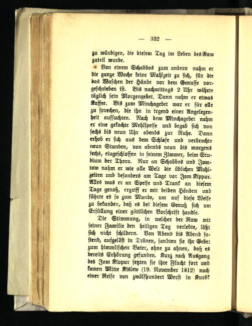 Die Stimmung, in welcher der Raw mit seiner Familie den heiligen Tag verlebte, läßt sich nicht schildern. Von Abend bis Abend fastend, aufgelöst in Tränen, sandten sie ihr Gebet zum himmlischen Vater, ohne zu ahnen, daß es bereits Erhörung gefunden. Kurz nach Ausgang des Jom Kivpur setzten sie ihre Flucht fort und kamen Mitte Kislew (19. November 1812) nach einer Reise von zwölfhundert Werst in Kursk