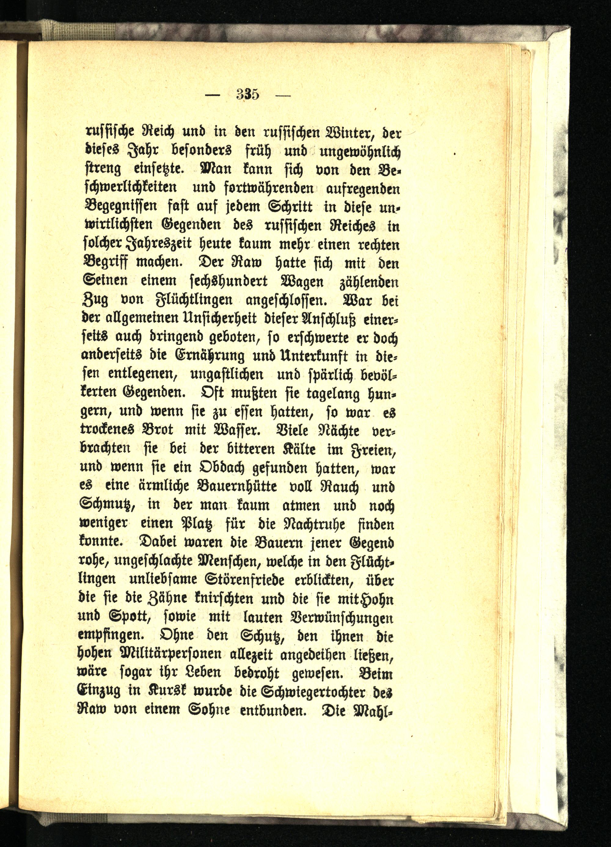 russische Reich und in den russischen Winter, der dieses Jahr besonders früh und ungewöhnlich streng einsetzte. Man kann sich von den Beschwerlichkeiten und fortwährenden aufregenden Begegnissen fast auf jedem Schritt in diese unwirtlichsten Gegenden des russischen Reiches in solcher Jahreszeit heute kaum mehr einen rechten Begriff machen. Der Raw hatte sich mit den Seinen einem sechshundert Wagen zählenden Zug von Flüchtlingen angeschlossen. War bei der allgemeinen Unsicherheit dieser Anschluß einerseits auch dringend geboten, so erschwerte er doch anderseits die Ernährung und Unterkunft in diesen entlegenen, ungastlichen und spärlich bevölkerten Gegenden. Oft mußten sie tagelang hungern, und wenn sie zu essen hatten, so war es trockenes Brot mit Wasser. Viele Nächte verbrachten sie bei der bitteren Kälte im Freien, und wenn sie ein Obdach gefunden hatten, war es eine ärmliche Bauernhütte voll Rauch und Schmutz, in der man kaum atmen und noch weniger einen Platz für die Nachtruhe finden konnte. Dabei waren die Bauern jener Gegend rohe, ungeschlachte Menschen, welche in den Flüchtlingen unliebsame Störenfriede erblickten, über die sie die Zähne knirschten und die sie mitHohn und Spott, sowie mit lauten Verwünschungen empfingen. Ohne den Schutz, den ihnen die hohen Milttärpersonen allezeit angedeihen ließen, wäre sogar ihr Leben bedroht gewesen. Beim Einzug in Kursk wurde die Schwiegertochter des Raw von einem Sohne entbunden. Die Mahl-
