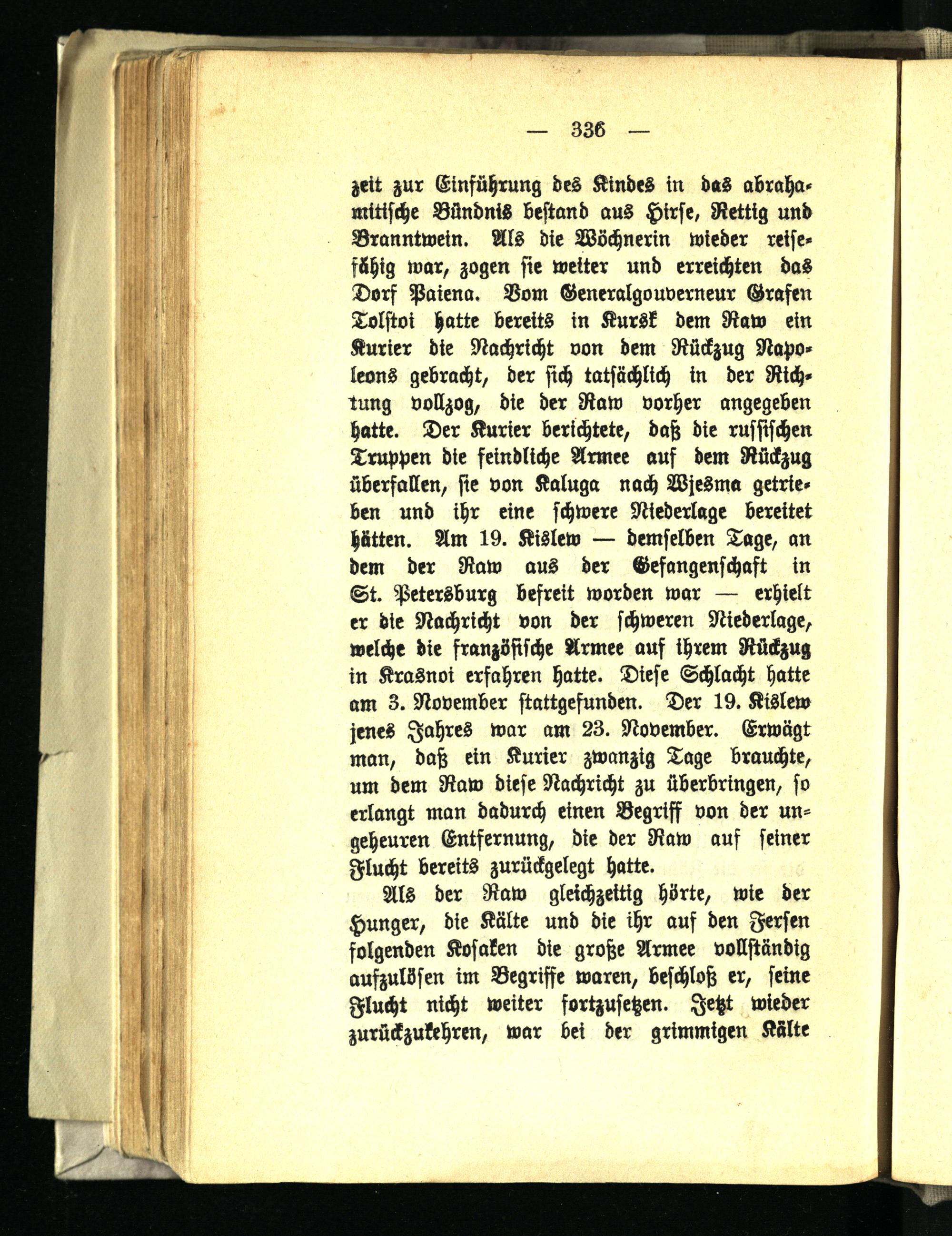 zeit zur Einführung des Kindes in das abraha- mitische Bündnis bestand aus Hirse, Retttg und Branntwein. Als die Wöchnerin wieder reisefähig war, zogen sie weiter und erreichten das Dorf Paiena. Vom Generalgouverneur Grafen Tolstoi hatte bereits in Kursk dem Raw ein Kurier die Nachricht von dem Rückzug Napoleons gebracht, der sich tatsächlich in der Richtung vollzog, die der Raw vorher angegeben hatte. Der Kurier berichtete, daß die russischen Truppen die feindliche Armee auf dem Rückzug überfallen, sie von Kaluga nach Wjesma getrieben und ihr eine schwere Niederlage bereitet hätten. Am 19. Kislew — demselben Tage, an dem der Raw aus der Gefangenschaft in St. Petersburg befreit worden war — erhielt er die Nachricht von der schweren Niederlage, welche die französische Armee auf ihrem Rückzug in Krasnoi erfahren hatte. Diese Schlacht hatte am 3. November stattgefunden. Der 19. Kislew jenes Jahres war am 23. November. Erwägt man, daß ein Kurier zwanzig Tage brauchte, um dem Raw diese Nachricht zu überbringen, so erlangt man dadurch einen Begriff von der ungeheuren Entfernung, die der Raw auf seiner Flucht bereits zurückgelegt hatte.