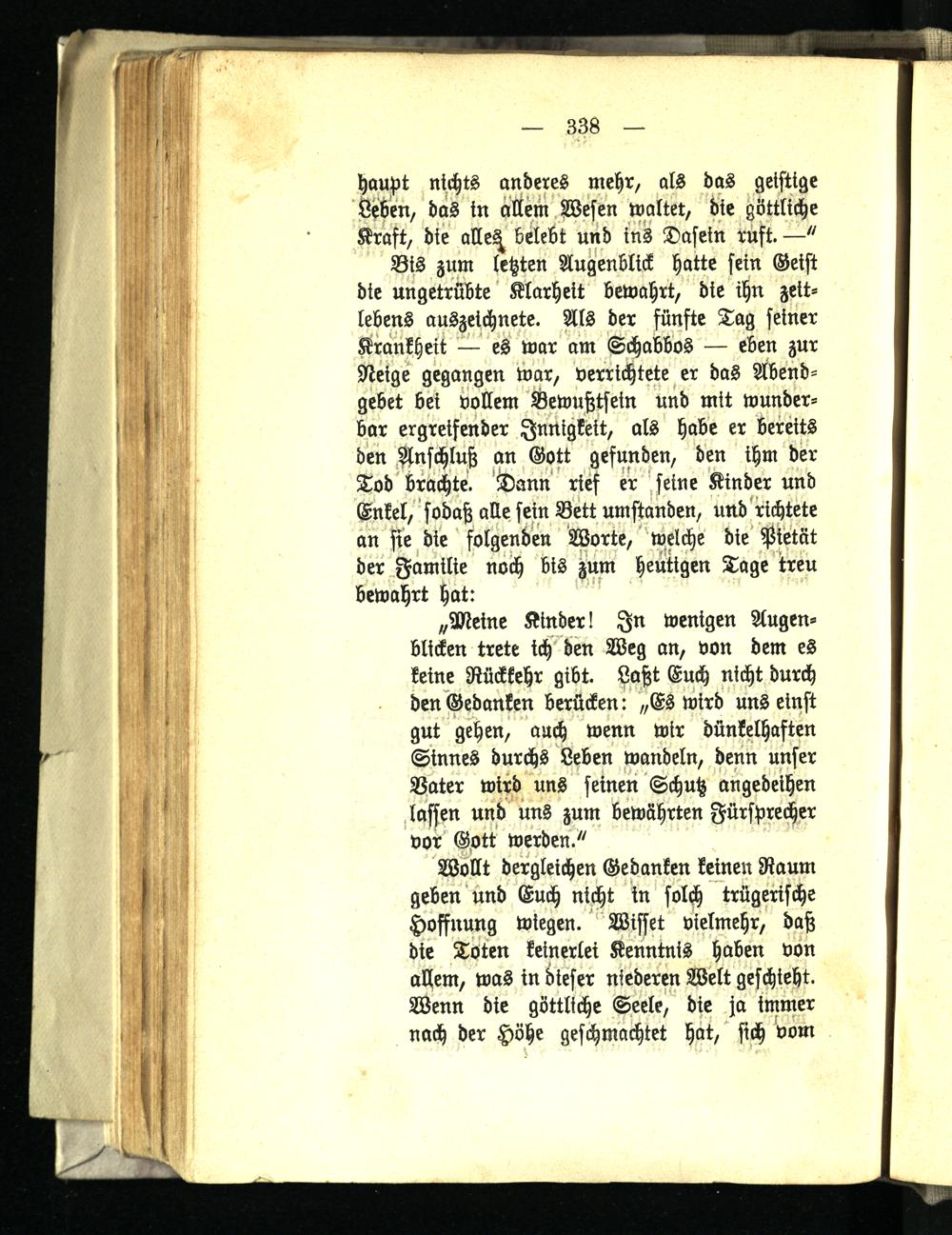 Haupt nichts anderes mehr, als das geistige Wen, das in altem Wesen waltet, die göttliche Kraft, die alle^ belebt und ins Dasein ruft. —" Bis zum letzten Augenblick hatte sein Geist die ungetrübte Klarheit bewahrt, die ihn zeitlebens auszeichnete. Als der fünfte Tag seiner Krankheit — es war am Schabbos — eben zur Neige gegangen war, verrichtete er das Abendgebet bei vollem Bewußtsein und mit wunderbar ergreifender Innigkeit, als habe er bereits den Anschluß an Gott gefunden, den ihm der Tod brachte. 'Dann rief er .seine Kinder und Enkel, sodaß alle sein Bett umstanden, und richtete an sie die folgenden Worte, welche die' Pietät der Familie noih bis zum heutigen Tage treu bewahrt hat: