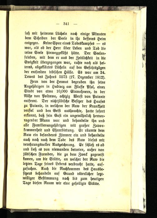 Fern von der Hermat begruben ihn seine Angehörigen in Hadiacz am Flusse Psol, einer Stadt von etwa 10,000 Einwohnern, in der Nähe von Poltawa, achtzig Werst von Paianie entfernt. Der nichtjüdische Besitzer des Hauses zu Paianie, in welchem der Raw der Krankheit verfiel und den Geist aushauchte, hatte sofort erkannt, daß sein Gast ein ungewöhnlich hervorragender Mann war und behandelte ihn und alle Familienangehörigen mit großer Zuvorkommenheit und Ehrerbietung. Er räumte dem Raw ein besonderes Zimmer ein und behandelte auch noch nach dem Tode des Raw dieses mit verehrungsvoller Auszeichnung. Er schloß es ab und ließ es von niemanden betreten, außer von jüdischen Fremden, die zu dem Zweck zugereist kamen, um die Stätte, an welcher der Raw die letzten Tage seines Lebens verbracht hatte, aufzusuchen. Auch die Nachkommen des Hausbesitzers behandeln auf Grund väterlicher letztwilliger Bestimmung noch bis zum heutigen Tage diesen Raum wie eine geheiligte Stätte.