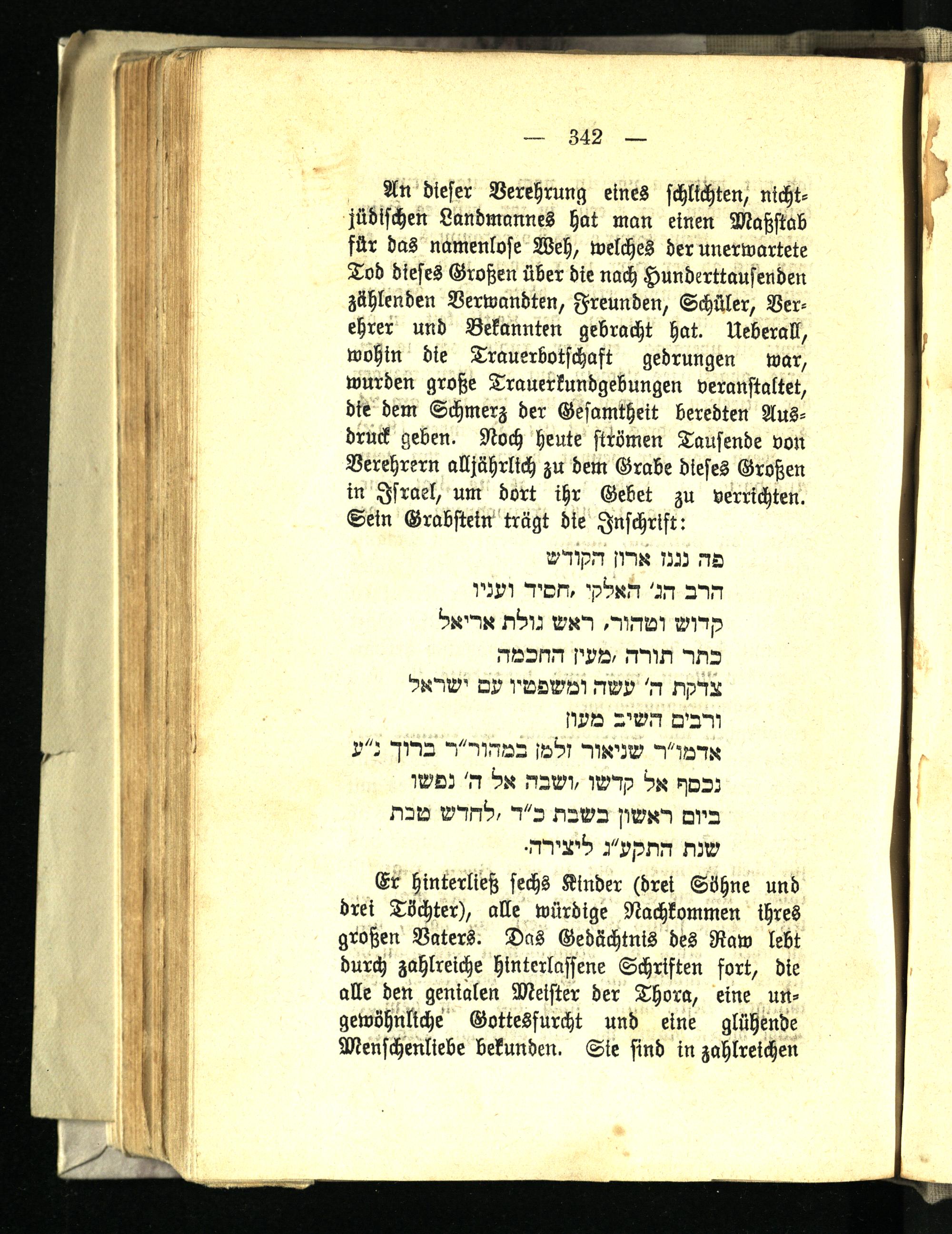Er hinterli'eß sechs Kinder (drei Söhne und drei Töchter), alle würdige Nachkommen ihres großen Vaters. Das Gedächtnis des Raw lebt durch zahlreiche hinterlassene Schriften fort, die alle den genialen Meister der Thora, eine ungewöhnliche" Gottesfurcht und eine glühende Menschenliebe bekunden. Sie sind in zahlreichen