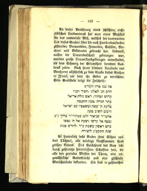 An'dieser Verehrung eines schlichten) nichtjüdischen Landmannes hat man einen Maßstab für das namenlose Weh, welches der unerwartete Tod dieses Großen über die nach Hunderttausenden zählenden Verwandten, Freunden, Schüler, Verehrer und Bekannten gebracht hat. Ueberall, wohin die Trauerbotschaft gedrungen war, wurden große Trauerkundgebungen veranstaltet, die dem Schmerz der Gesamtheit beredten Ausdrück geben. Noch heute strömen Tausende von Verehrern alljährlich zu dem Grabe dieses Großen in Israel, um dort ihr Gebet zu verrichten. Sein Grabstein'trägt die Inschrift: