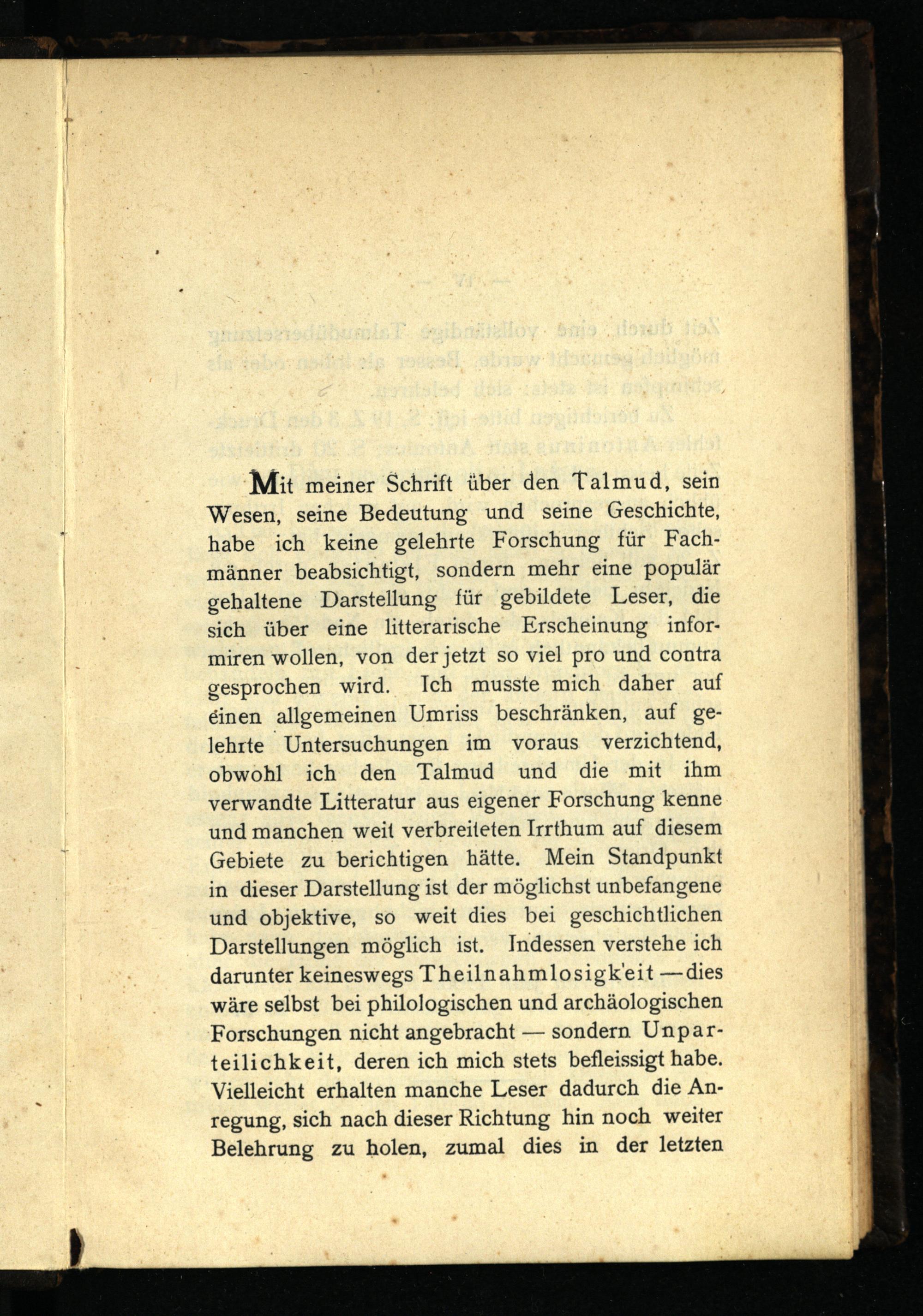 Mit meiner Schrift über den Talmud, sein Wesen, seine Bedeutung und seine Geschichte, habe ich keine gelehrte Forschung für Fachmänner beabsichtigt, sondern mehr eine populär gehaltene Darstellung für gebildete Leser, die sich über eine litterarische Erscheinung infor- miren wollen, von der jetzt so viel pro und contra gesprochen wird. Ich musste mich daher auf einen allgemeinen Umriss beschränken, auf gelehrte Untersuchungen im voraus verzichtend, obwohl ich den Talmud und die mit ihm verwandte Litteratur aus eigener Forschung kenne und manchen weit verbreiteten Irrthum auf diesem Gebiete zu berichtigen hätte. Mein Standpunkt in dieser Darstellung ist der möglichst unbefangene und objektive, so weit dies bei geschichtlichen Darstellungen möglich ist. Indessen verstehe ich darunter keineswegs Theilnahmlosigkeit —dies wäre selbst bei philologischen und archäologischen Forschungen nicht angebracht — sondern Unparteilichkeit, deren ich mich stets befleissigt habe. Vielleicht erhalten manche Leser dadurch die Anregung, sich nach dieser Richtung hin noch weiter Belehrung zu holen, zumal dies in der letzten