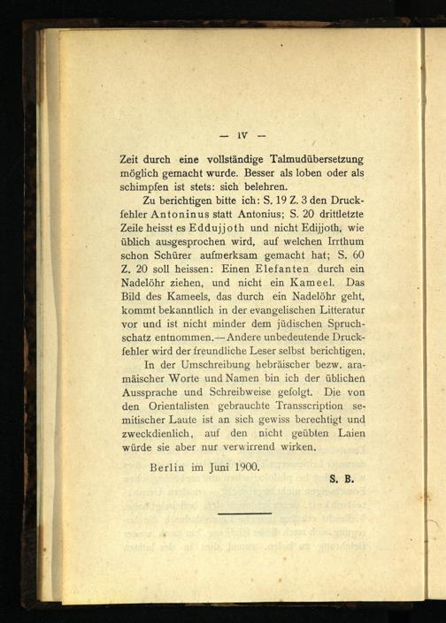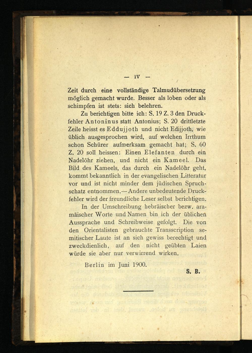 Zu berichtigen bitte ich: S. 19 Z. 3 den Druckfehler Antoninus statt Antonius; S. 20 drittletzte Zeile heisst es Eddujjoth und nicht Edijjoth, wie üblich ausgesprochen wird, auf welchen Irrthum schon Schürer aufmerksam gemacht hat; S. 60 Z. 20 soll heissen: Einen Elefanten durch ein Nadelöhr ziehen, und nicht ein Kameel. Das Bild des Kameels, das durch ein Nadelöhr geht, kommt bekanntlich in der evangelischen Litteratur vor und ist nicht minder dem jüdischen Spruchschatz entnommen.— Andere unbedeutende Druckfehler wird der freundliche Leser selbst berichtigen.