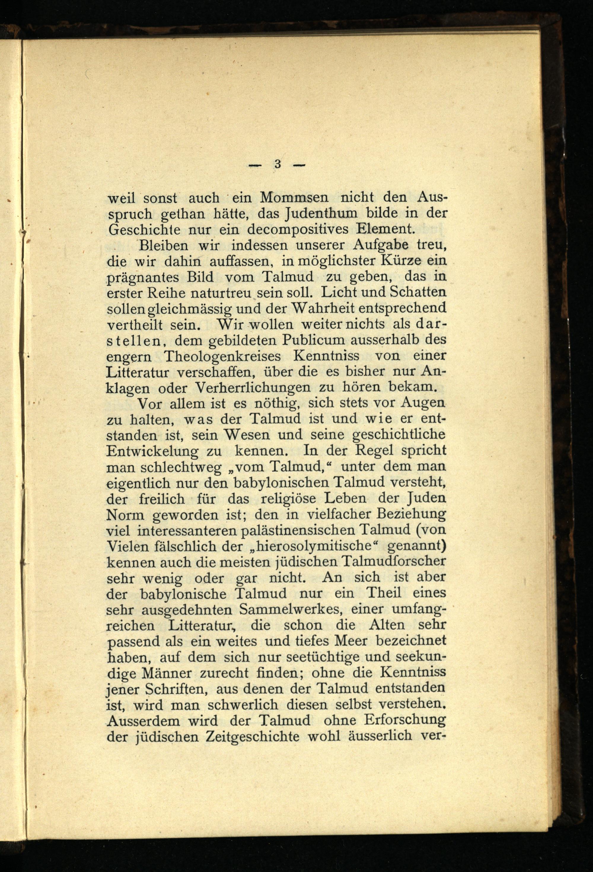 Vor allem ist es nöthig, sich stets vor Augen zu halten, was der Talmud ist und wie er entstanden ist, sein Wesen und seine geschichtliche Entwickelung zu kennen. In der Regel spricht man schlechtweg „vom Talmud,“ unter dem man eigentlich nur den babylonischen Talmud versteht, der freilich für das religiöse Leben der Juden Norm geworden ist; den in vielfacher Beziehung viel interessanteren palästinensischen Talmud (von Vielen fälschlich der „hierosolymitische“ genannt) kennen auch die meisten jüdischen Talmudforscher sehr wenig oder gar nicht. An sich ist aber der babylonische Talmud nur ein Theil eines sehr ausgedehnten Sammelwerkes, einer umfangreichen Litteratur, die schon die Alten sehr passend als ein weites und tiefes Meer bezeichnet haben, auf dem sich nur seetüchtige und seekundige Männer zurecht finden; ohne die Kenntniss jener Schriften, aus denen der Talmud entstanden ist, wird man schwerlich diesen selbst verstehen. Ausserdem wird der Talmud ohne Erforschung der jüdischen Zeitgeschichte wohl äusserlich ver-