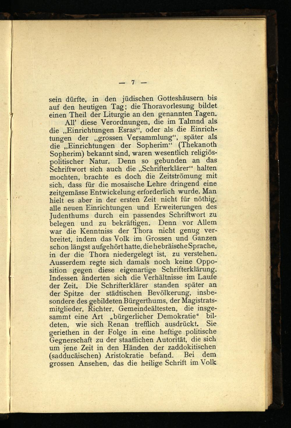 All’ diese Verordnungen, die im Talmnd als die „Einrichtungen Esras“, oder als die Einrichtungen der „grossen Versammlung“, später als die „Einrichtungen der Sopherim“ (Thekanoth Sopherim) bekannt sind, waren wesentlich religiöspolitischer Natur. Denn so gebunden an das Schriftwort sich auch die „Schrifterklärer“ halten mochten, brachte es doch die Zeitströmung mit sich, dass für die mosaische Lehre dringend eine zeitgemässe Entwickelung erforderlich wurde. Man hielt es aber in der ersten Zeit nicht für nöthig, alle neuen Einrichtungen und Erweiterungen des Judenthums durch ein passendes Schriftwort zu belegen und zu bekräftigen. Denn vor Allem war die Kenntniss der Thora nicht genug verbreitet, indem das Volk im Grossen und Ganzen schon längst aufgehört hatte, die hebräische Sprache, in der die Thora niedergelegt ist, zu verstehen. Ausserdem regte sich damals noch keine Opposition gegen diese eigenartige Schrifterklärung. Indessen änderten sich die Verhältnisse im Laufe der Zeit. Die Schrifterklärer standen später an der Spitze der städtischen Bevölkerung, insbesondere des gebildeten Bürgerthums, der Magistratsmitglieder, Richter. Gemeindeältesten, die insge- sammt eine Art „bürgerlicher Demokratie“ bildeten, wie sich Renan trefflich ausdrückt. Sie geriethen in der Folge in eine heftige politische Gegnerschaft zu der staatlichen Autorität, die sich um jene Zeit in den Händen der zaddokitischen (sadducäischen) Aristokratie befand. Bei dem grossen Ansehen, das die heilige Schrift im Volk