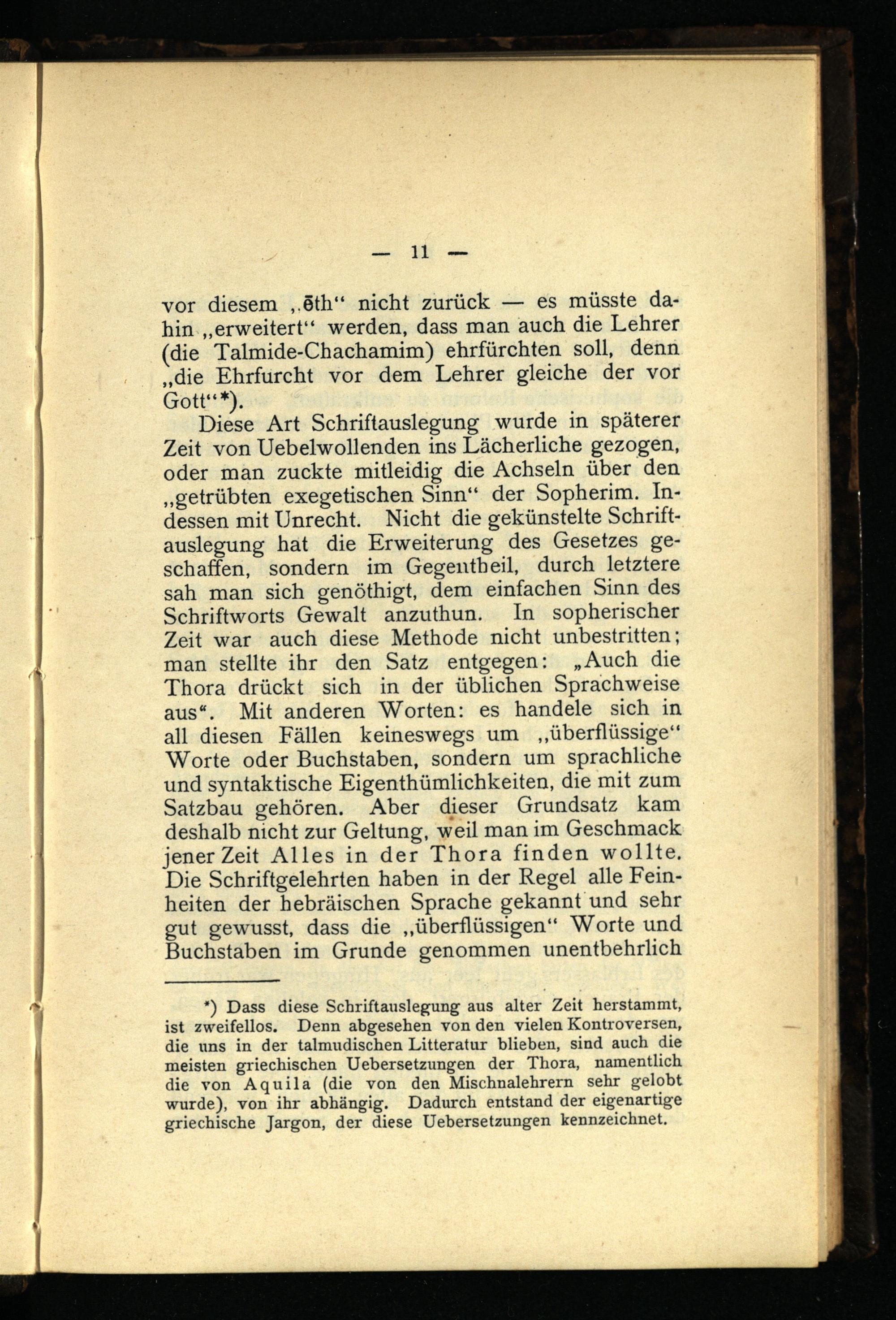 *) Dass diese Schriftauslegung aus alter Zeit herstammt, ist zweifellos. Denn abgesehen von den vielen Kontroversen, die uns in der talmudischen Litteratur blieben, sind auch die meisten griechischen Uebersetzungen der Thora, namentlich die von Aquila (die von den Mischnalehrern sehr gelobt wurde), von ihr abhängig. Dadurch entstand der eigenartige griechische Jargon, der diese Uebersetzungen kennzeichnet.