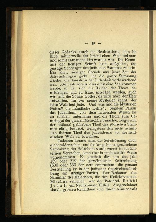 dieser Gedanke durch die Beobachtung, dass die Bibel mittlerweile der heidnischen Welt bekannt und somit entnationalisirt worden war. Die Kennt- niss der heiligen Schrift hatte aufgehört, das geistige Sondergut des jüdischen Stammes zu sein. Ein alter, sinniger Spruch aus jener Zeit der Schwankungen giebt uns die ganze Stimmung wieder, die damals in der Judenheit vorherrschend war. „Gott sah voraus, dass einst eine Zeit kommen werde, in der sich die Heiden der Thora bemächtigen und zu Israel sprechen werden, auch wir sind die Söhne Gottes; da wird aber der Herr antworten, nur wer meine Mysterien kennt, der ist in Wahrheit Jude. Und was sind die Mysterien Gottes? die mündliche Lehre“. Seitdem Paulus das Judenthum von dem nationalen Wesen los zu schälen unternahm und die Thora zum Gemeingut der ganzen Menschheit machte, zeigte sich der national gebliebene Theil des jüdischen Stammes eifrig bestrebt, wenigstens den nicht schriftlich fixirten Theil des Judenthums vor der heidnischen Welt zu bewahren.