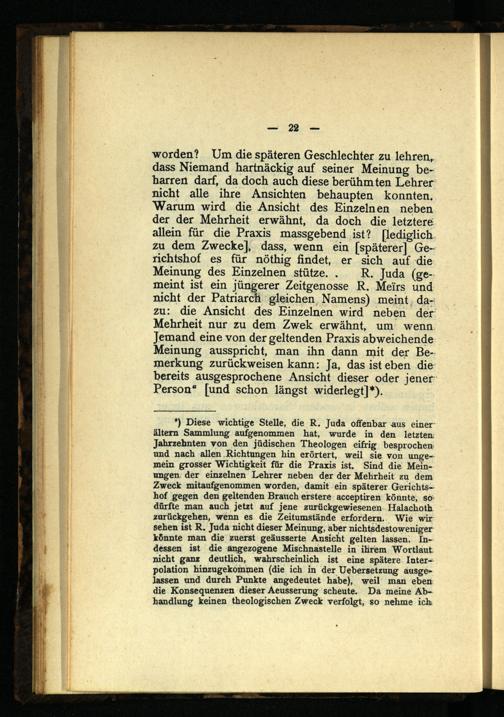 *) Diese wichtige Stelle, die R. Juda offenbar aus einer ältern Sammlung aufgenommen hat, wurde in den letzten. Jahrzehnten von den jüdischen Theologen eifrig besprochen und nach allen Richtungen hin erörtert, weil sie von ungemein grosser Wichtigkeit für die Praxis ist. Sind die Meinungen der einzelnen Lehrer neben der der Mehrheit zu dem Zweck mitaufgenommen worden, damit ein späterer Gerichtshof gegen den geltenden Brauch erstere acceptiren könnte, so dürfte man auch jetzt auf jene zurückgewiesenen Halachoth zurückgehen, wenn es die Zeitumstände erfordern. Wie wir sehen ist R. Juda nicht dieser Meinung, aber nichtsdestoweniger könnte man die zuerst geäusserte Ansicht gelten lassen. Indessen ist die angezogene Mischnastelle in ihrem Wortlaut nicht ganz deutlich, wahrscheinlich ist eine spätere Interpolation hinzugekommen (die ich in der Uebersetzung ausgelassen und dureh Punkte angedeutet habe), weil man eben die Konsequenzen dieser Aeusserung scheute. Da meine Abhandlung keinen theologischen Zweck verfolgt, so nehme ich.