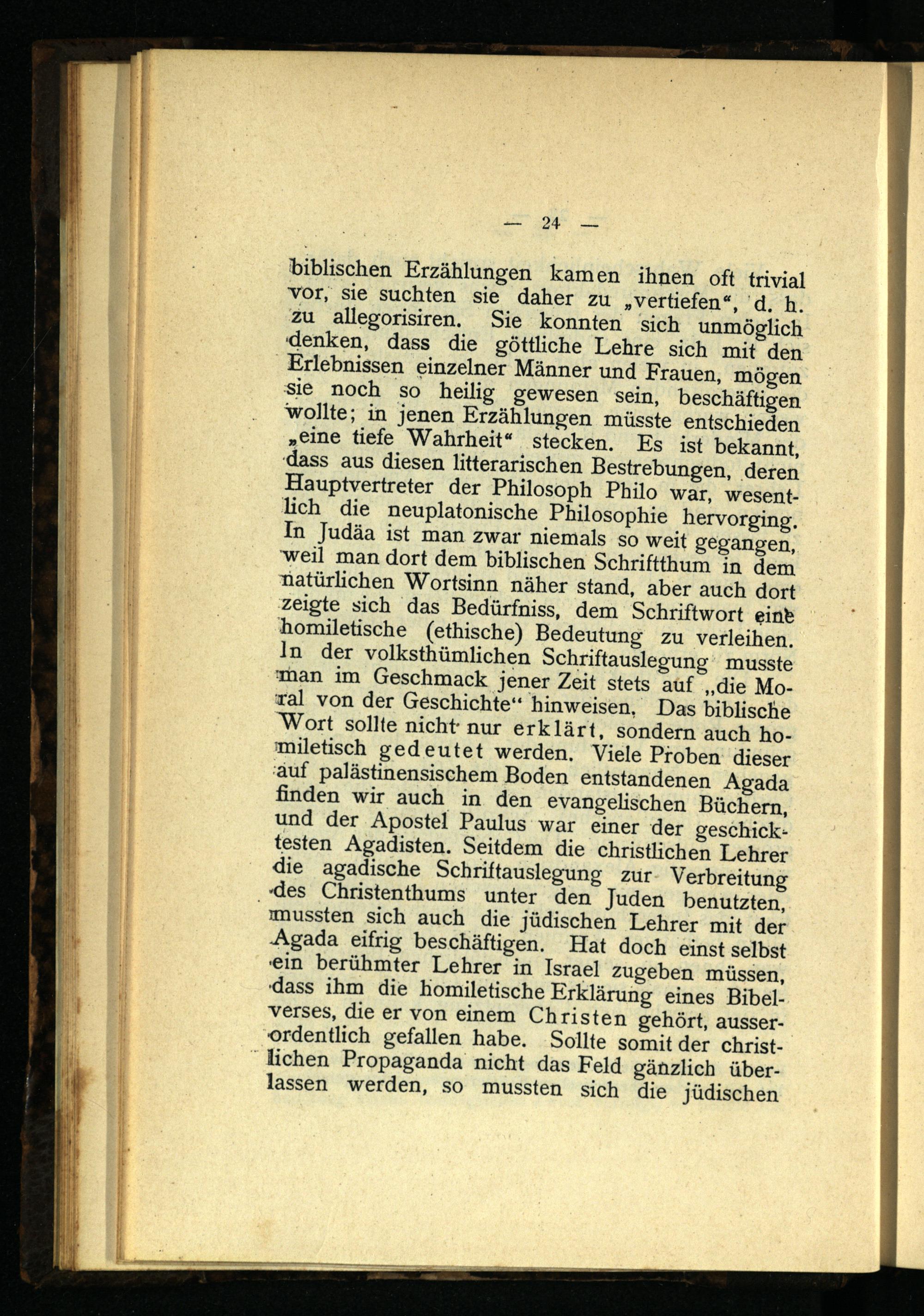 biblischen Erzählungen kamen ihnen oft trivial vor, sie suchten sie daher zu „vertiefen“, d. h. zu allegorisiren. Sie konnten sich unmöglich denken, dass die göttliche Lehre sich mit den Erlebnissen einzelner Männer und Frauen, mögen sie noch so heilig gewesen sein, beschäftigen wollte; in jenen Erzählungen müsste entschieden „eine tiefe Wahrheit“ stecken. Es ist bekannt, dass aus diesen litterarischen Bestrebungen, deren Hauptvertreter der Philosoph Philo war, wesentlich die neuplatonische Philosophie hervorging. In Judäa ist man zwar niemals so weit gegangen, weil man dort dem biblischen Schriftthum in dem natürlichen Wortsinn näher stand, aber auch dort zeigte sich das Bedürfniss, dem Schriftwort einte homiletische (ethische) Bedeutung zu verleihen, ln der volkstümlichen Schriftauslegung musste man im Geschmack jener Zeit stets auf „die Moral von der Geschichte“ hinweisen, Das biblische Wort sollte nicht- nur erklärt, sondern auch homiletisch gedeutet werden. Viele Proben dieser auf palästinensischem Boden entstandenen Agada finden wir auch in den evangelischen Büchern, und der Apostel Paulus war einer der geschickt testen Agadisten. Seitdem die christlichen Lehrer die agadische Schriftauslegung zur Verbreitung des Christenthums unter den Juden benutzten, mussten sich auch die jüdischen Lehrer mit der Agada eifrig beschäftigen. Hat doch einst selbst ein berühmter Lehrer in Israel zugeben müssen, dass ihm die homiletische Erklärung eines Bibel- verses, die er von einem Christen gehört, ausserordentlich gefallen habe. Sollte somit der christlichen Propaganda nicht das Feld gänzlich überlassen werden, so mussten sich die jüdischen