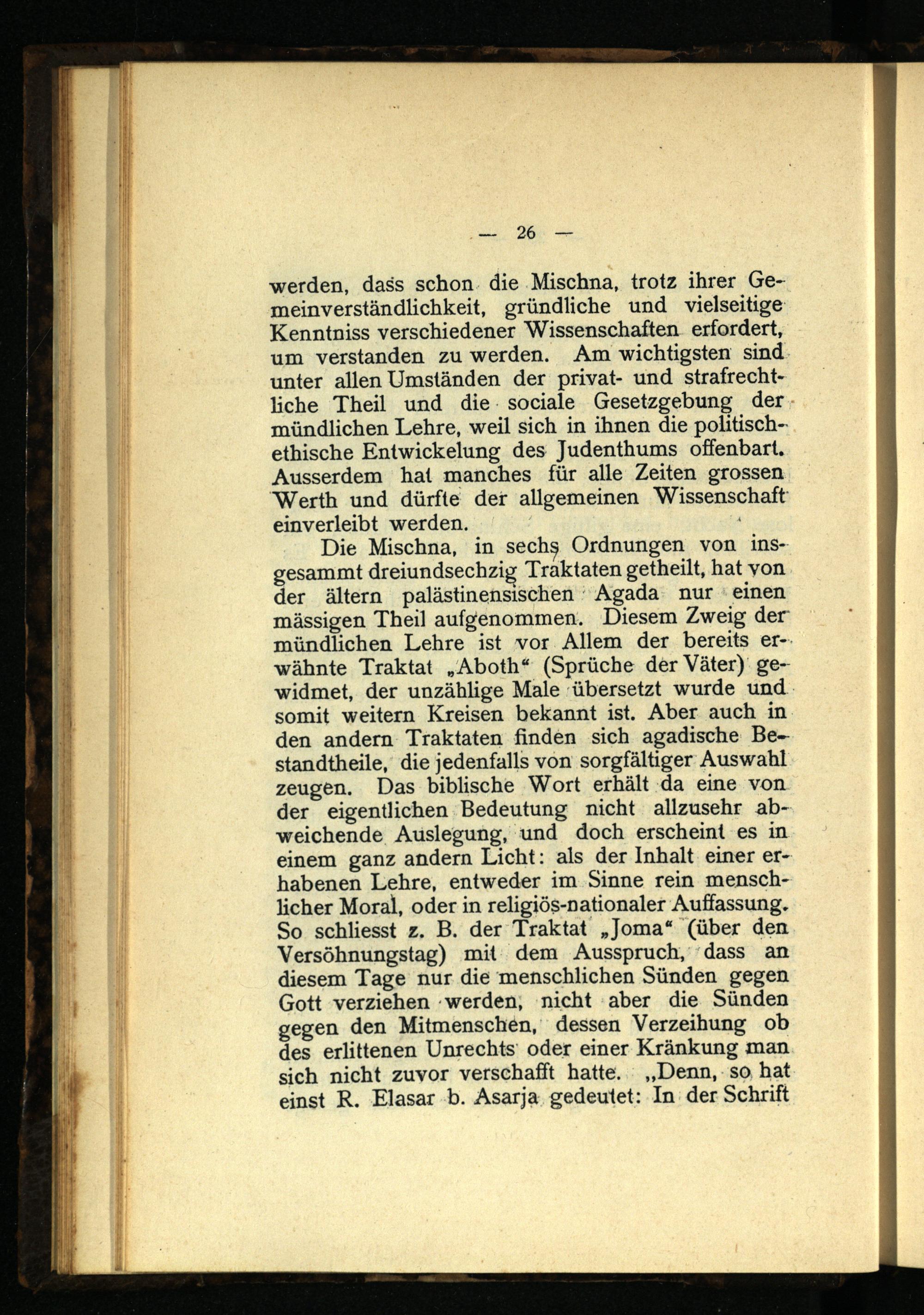Die Mischna, in sechs; Ordnungen von ins- gesammt dreiundsechzig Traktaten getheilt, hat von der ältern palästinensischen Agada nur einen mässigen Theil aufgenommen. Diesem Zweig der mündlichen Lehre ist vor Allem der bereits erwähnte Traktat „Aboth“ (Sprüche der Väter) gewidmet, der unzählige Male übersetzt wurde und somit weitern Kreisen bekannt ist. Aber auch in den andern Traktaten finden sich agadische Be- standtheile, die jedenfalls von sorgfältiger Auswahl zeugen. Das biblische Wort erhält da eine von der eigentlichen Bedeutung nicht allzusehr abweichende Auslegung, und doch erscheint es in einem ganz andern Licht: als der Inhalt einer erhabenen Lehre, entweder im Sinne rein menschlicher Moral, oder in religiös-nationaler Auffassung. So schliesst z. B. der Traktat „Joma“ '(über den Versöhnungstag) mit dem Ausspruch, dass an diesem Tage nur die menschlichen Sünden gegen Gott verziehen werden, nicht aber die Sünden gegen den Mitmenschen, dessen Verzeihung ob des erlittenen Unrechts oder einer Kränkung man sich nicht zuvor verschafft hatte. „Denn, so hat einst R. Elasar b. Asarja gedeutet: In der Schrift