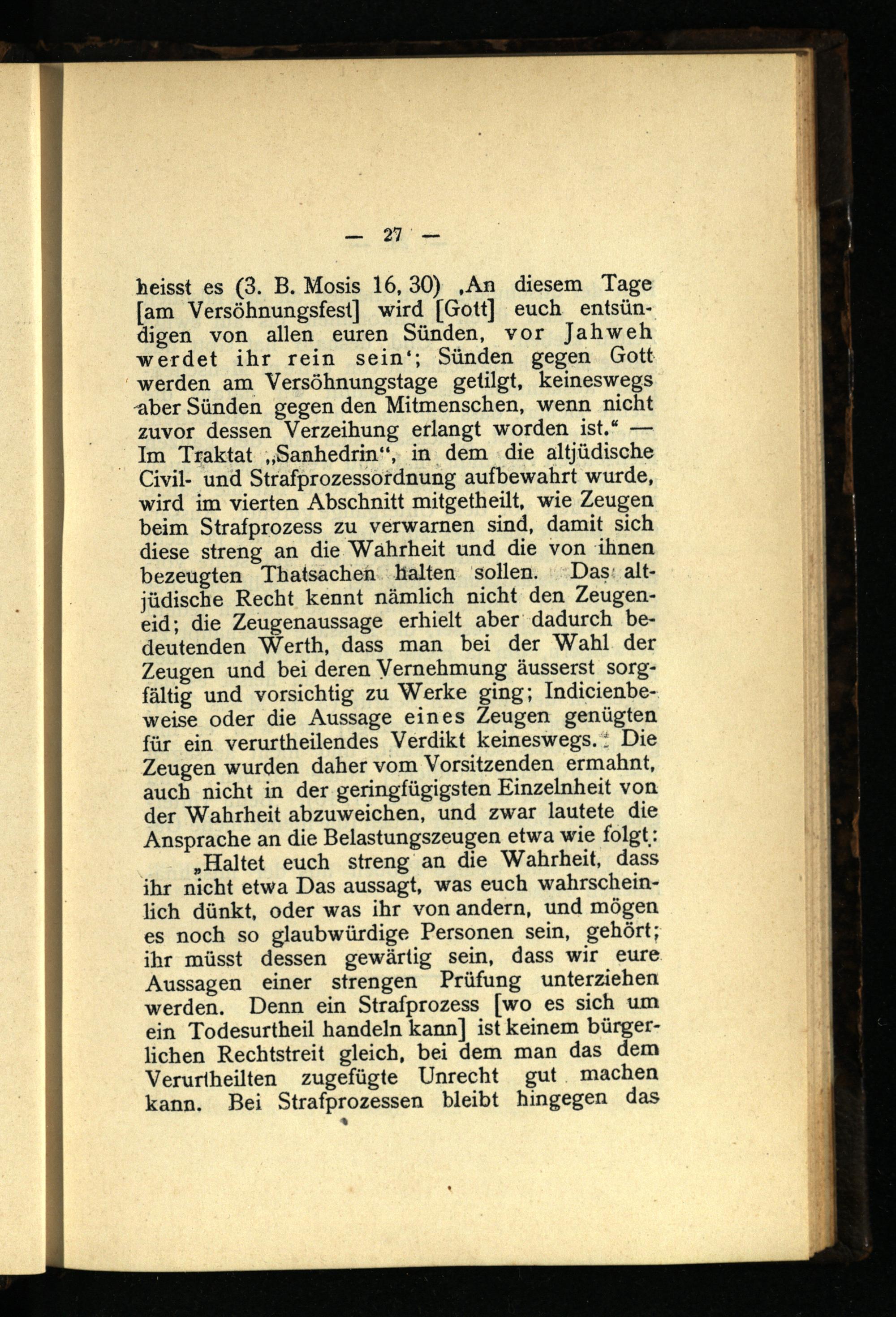 heisst es (3. B. Mosis 16, 30) ,An diesem Tage [am Versöhnungsfest] wird [Gott] euch entsün- digen von allen euren Sünden, vor Jahweh werdet ihr rein sein*; Sünden gegen Gott werden am Versöhnungstage getilgt, keineswegs aber Sünden gegen den Mitmenschen, wenn nicht zuvor dessen Verzeihung erlangt worden ist.“ — Im Traktat „Sanhedrin“, in dem die altjüdische Civil- und Strafprozessordnung aufbewahrt wurde, wird im vierten Abschnitt mitgetheilt, wie Zeugen beim Strafprozess zu verwarnen sind, damit sich diese streng an die Wahrheit und die von ihnen bezeugten Thatsachen halten sollen. Das; altjüdische Recht kennt nämlich nicht den Zeugeneid; die Zeugenaussage erhielt aber dadurch bedeutenden Werth, dass man bei der Wahl der Zeugen und bei deren Vernehmung äusserst sorgfältig und vorsichtig zu Werke ging; Indicienbe- weise oder die Aussage eines Zeugen genügten für ein verurtheilendes Verdikt keineswegs.; Die Zeugen wurden daher vom Vorsitzenden ermahnt, auch nicht in der geringfügigsten Einzelnheit von der Wahrheit abzuweichen, und zwar lautete die Ansprache an die Belastungszeugen etwa wie folgt.: »Haltet euch streng an die Wahrheit, dass ihr nicht etwa Das aussagt, was euch wahrscheinlich dünkt, oder was ihr von andern, und mögen es noch so glaubwürdige Personen sein, gehört; ihr müsst dessen gewärtig sein, dass wir eure Aussagen einer strengen Prüfung unterziehen werden. Denn ein Strafprozess [wo es sich um ein Todesurtheil handeln kann] ist keinem bürgerlichen Rechtstreit gleich, bei dem man das dem Verurtheilten zugefügte Unrecht gut machen kann. Bei Strafprozessen bleibt hingegen das