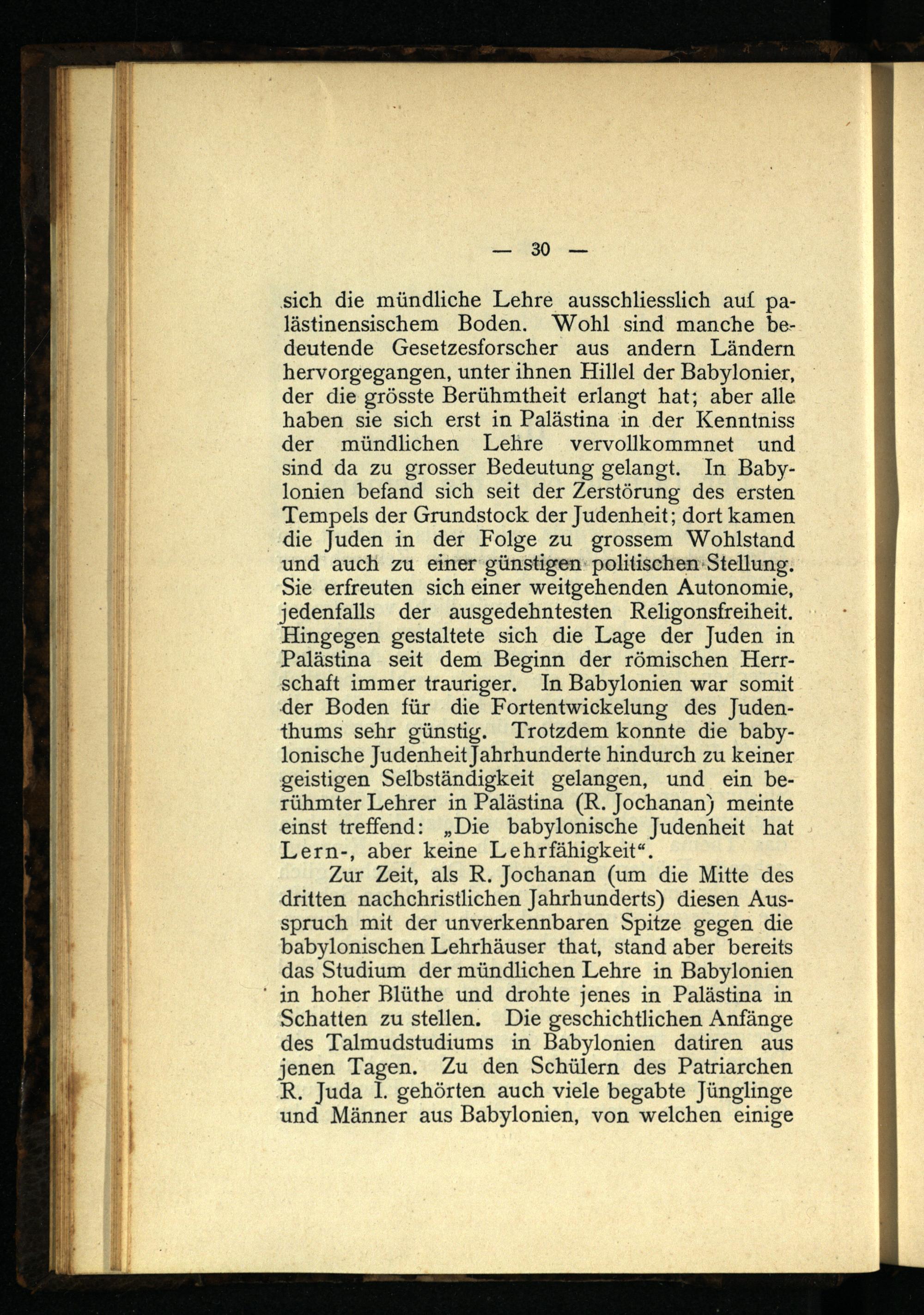 sich die mündliche Lehre ausschliesslich auf palästinensischem Boden. Wohl sind manche bedeutende Gesetzesforscher aus andern Ländern hervorgegangen, unter ihnen Hillel der Babylonier, der die grösste Berühmtheit erlangt hat; aber alle haben sie sich erst in Palästina in der Kenntniss der mündlichen Lehre vervollkommnet und sind da zu grosser Bedeutung gelangt. In Babylonien befand sich seit der Zerstörung des ersten Tempels der Grundstock der Judenheit; dort kamen die Juden in der Folge zu grossem Wohlstand und auch zu einer günstigen politischen Stellung. Sie erfreuten sich einer weitgehenden Autonomie, jedenfalls der ausgedehntesten Religonsfreiheit. Hingegen gestaltete sich die Lage der Juden in Palästina seit dem Beginn der römischen Herrschaft immer trauriger. In Babylonien war somit der Boden für die Fortentwickelung des Judenthums sehr günstig. Trotzdem konnte die babylonische Judenheit Jahrhunderte hindurch zu keiner geistigen Selbständigkeit gelangen, und ein berühmter Lehrer in Palästina (R. Jochanan) meinte einst treffend: „Die babylonische Judenheit hat Lern-, aber keine Lehrfähigkeit“.