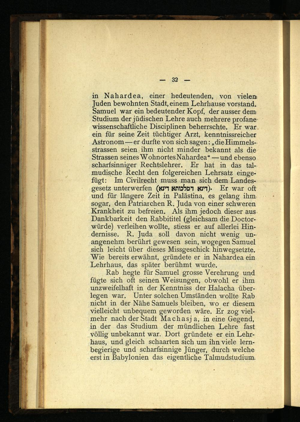 in Nahardea, einer bedeutenden, von vielen Juden bewohnten Stadt, einem Lehrhause Vorstand. Samuel war ein bedeutender Kopf, der ausser dem Studium der jüdischen Lehre auch mehrere profane wissenschaftliche Disciplinen beherrschte. Er war ein für seine Zeit tüchtiger Arzt, kenntnissreicher Astronom — er durfte von sich sagen: „die Himmelsstrassen seien ihm nicht minder bekannt als die Strassen seines Wohnortes Nahardea“—und ebenso scharfsinniger Rechtslehrer. Er hat in das tal- mudische Recht den folgereichen Lehrsatz eingefügt: Im Civilrecht muss man sich dem Landes