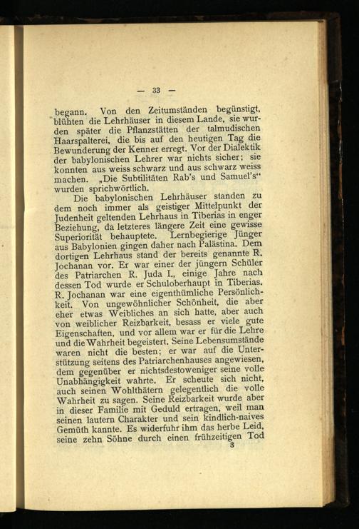Die babylonischen Lehrhäuser standen zu dem noch immer als geistiger Mittelpunkt der Judenheit geltenden Lehrhaus in Tiberias in enger Beziehung, da letzteres längere Zeit eine gewisse Superiorität behauptete. Lernbegierige Jünger aus Babylonien gingen daher nach Palästina. Dem dortigen Lehrhaus stand der bereits genannte R. Jochanan vor. Er war einer der jüngern Schüler des Patriarchen R. Juda I., einige Jahre nach dessen Tod wurde er Schuloberhaupt in Tiberias. R. Jochanan war eine eigenthümliche Persönlichkeit. Von ungewöhnlicher Schönheit, die aber eher etwas Weibliches an sich hatte, aber auch von weiblicher Reizbarkeit, besass er viele gute Eigenschaften, und vor allem war er für die Lehre und die Wahrheit begeistert. Seine Lebensumstände waren nicht die besten; er war auf die Unterstützung seitens des Patriarchenhauses angewiesen, dem gegenüber er nichtsdestoweniger seine volle Unabhängigkeit wahrte. Er scheute sich nicht, auch seinen Wohlthätern gelegentlich die volle Wahrheit zu sagen. Seine Reizbarkeit wurde aber in dieser Familie mit Geduld ertragen, weil man seinen lautern Charakter und sein kindlich-naives Gemüth kannte. Es widerfuhr ihm das herbe Leid, seine zehn Söhne durch einen frühzeitigen Tod
