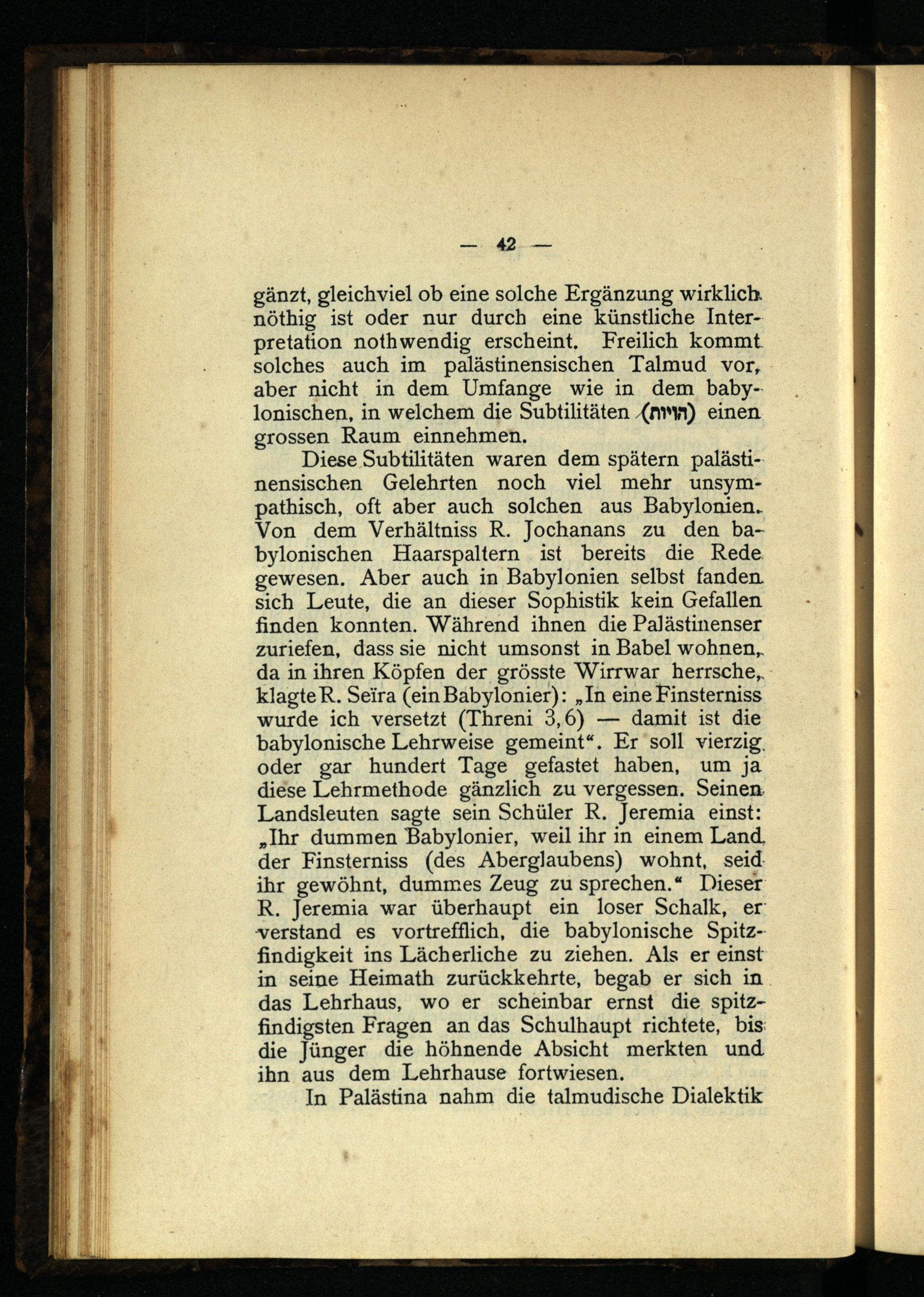 Diese Subtilitäten waren dem spätem palästinensischen Gelehrten noch viel mehr unsympathisch, oft aber auch solchen aus Babylonien. Von dem Verhältniss R. Jochanans zu den babylonischen Haarspaltern ist bereits die Rede gewesen. Aber auch in Babylonien selbst fanden, sich Leute, die an dieser Sophistik kein Gefallen finden konnten. Während ihnen die Palästinenser zuriefen, dass sie nicht umsonst in Babel wohnen,, da in ihren Köpfen der grösste Wirrwar herrsche,, klagte R. Seira (ein Babylonier): „In eine Finsterniss wurde ich versetzt (Threni 3,6) — damit ist die babylonische Lehrweise gemeint“. Er soll vierzig, oder gar hundert Tage gefastet haben, um ja diese Lehrmethode gänzlich zu vergessen. Seinen Landsleuten sagte sein Schüler R. Jeremia einst: „Ihr dummen Babylonier, weil ihr in einem Land, der Finsterniss (des Aberglaubens) wohnt, seid ihr gewöhnt, dummes Zeug zu sprechen.“ Dieser R. Jeremia war überhaupt ein loser Schalk, er verstand es vortrefflich, die babylonische Spitzfindigkeit ins Lächerliche zu ziehen. Als er einst in seine Heimath zurückkehrte, begab er sich in das Lehrhaus, wo er scheinbar ernst die spitzfindigsten Fragen an das Schulhaupt richtete, bis die Jünger die höhnende Absicht merkten und ihn aus dem Lehrhause fortwiesen.