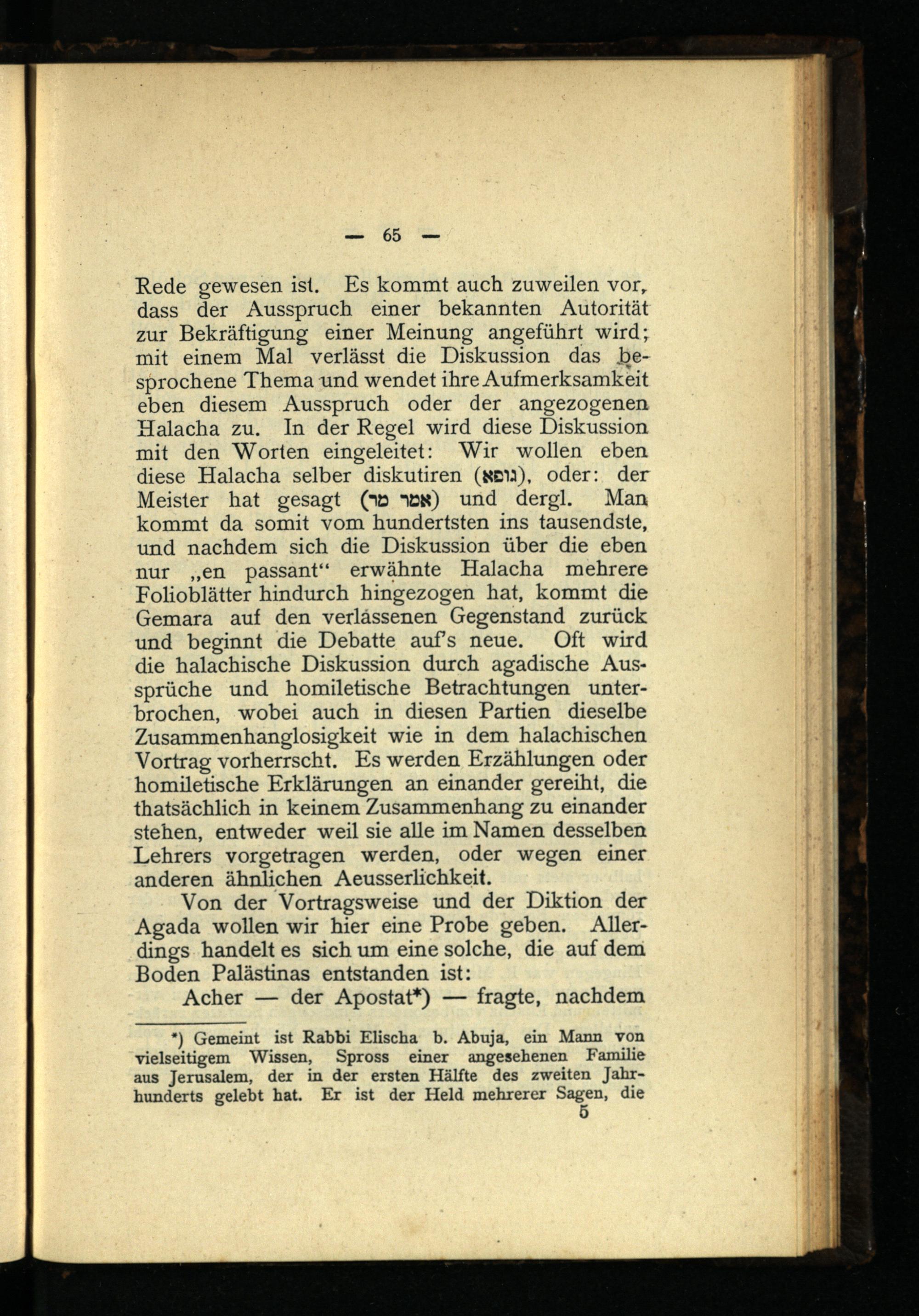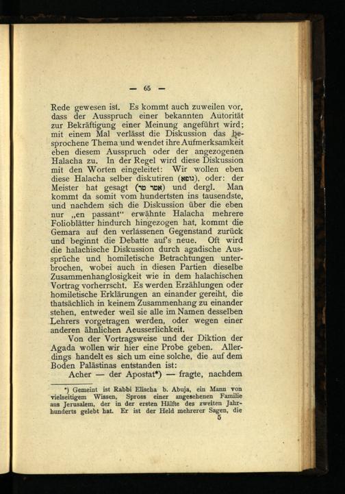 *) Gemeint ist Rabbi Elischa b. Abuja, ein Mann von vielseitigem Wissen, Spross einer angesehenen Familie aus Jerusalem, der in der ersten Hälfte des zweiten Jahrhunderts gelebt hat. Er ist der Held mehrerer Sagen, die