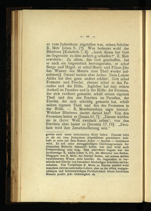 er vom Judenthum abgefallen war, seinen Schüler R. Meir [oben S. 19], Was bedeutet wohl der Bibelvers [Koheleth 7, 4]: „Auch dieses hat Gott im Gegensatz zu dem andern geschaffen?“ R. Meir erwiderte: Zu allem, das Gott geschaffen, hat
