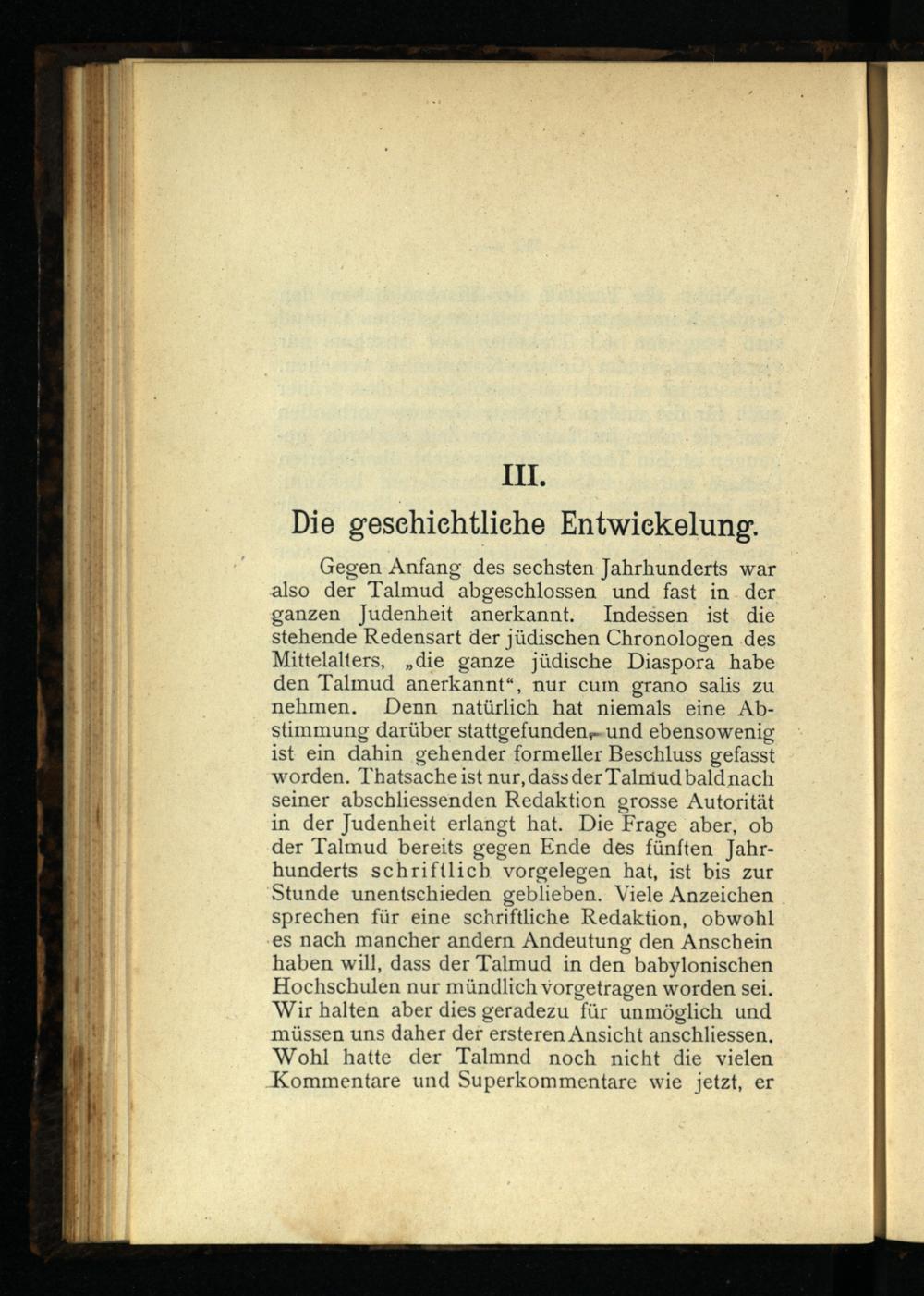 Gegen Anfang des sechsten Jahrhunderts war also der Talmud abgeschlossen und fast in der ganzen Judenheit anerkannt. Indessen ist die stehende Redensart der jüdischen Chronologen des Mittelalters, „die ganze jüdische Diaspora habe den Talmud anerkannt“, nur cum grano salis zu nehmen. Denn natürlich hat niemals eine Abstimmung darüber stattgefunden,- und ebensowenig ist ein dahin gehender formeller Beschluss gefasst worden. Thatsache ist nur, dass der Talmud bald nach seiner abschliessenden Redaktion grosse Autorität in der Judenheit erlangt hat. Die Frage aber, ob der Talmud bereits gegen Ende des fünften Jahrhunderts schriftlich Vorgelegen hat, ist bis zur Stunde unentschieden geblieben. Viele Anzeichen sprechen für eine schriftliche Redaktion, obwohl es nach mancher andern Andeutung den Anschein haben will, dass der Talmud in den babylonischen Hochschulen nur mündlich vorgetragen worden sei. Wir halten aber dies geradezu für unmöglich und müssen uns daher der ersterenAnsicht anschliessen. Wohl hatte der Talmnd noch nicht die vielen Kommentare und Superkommentare wie jetzt, er