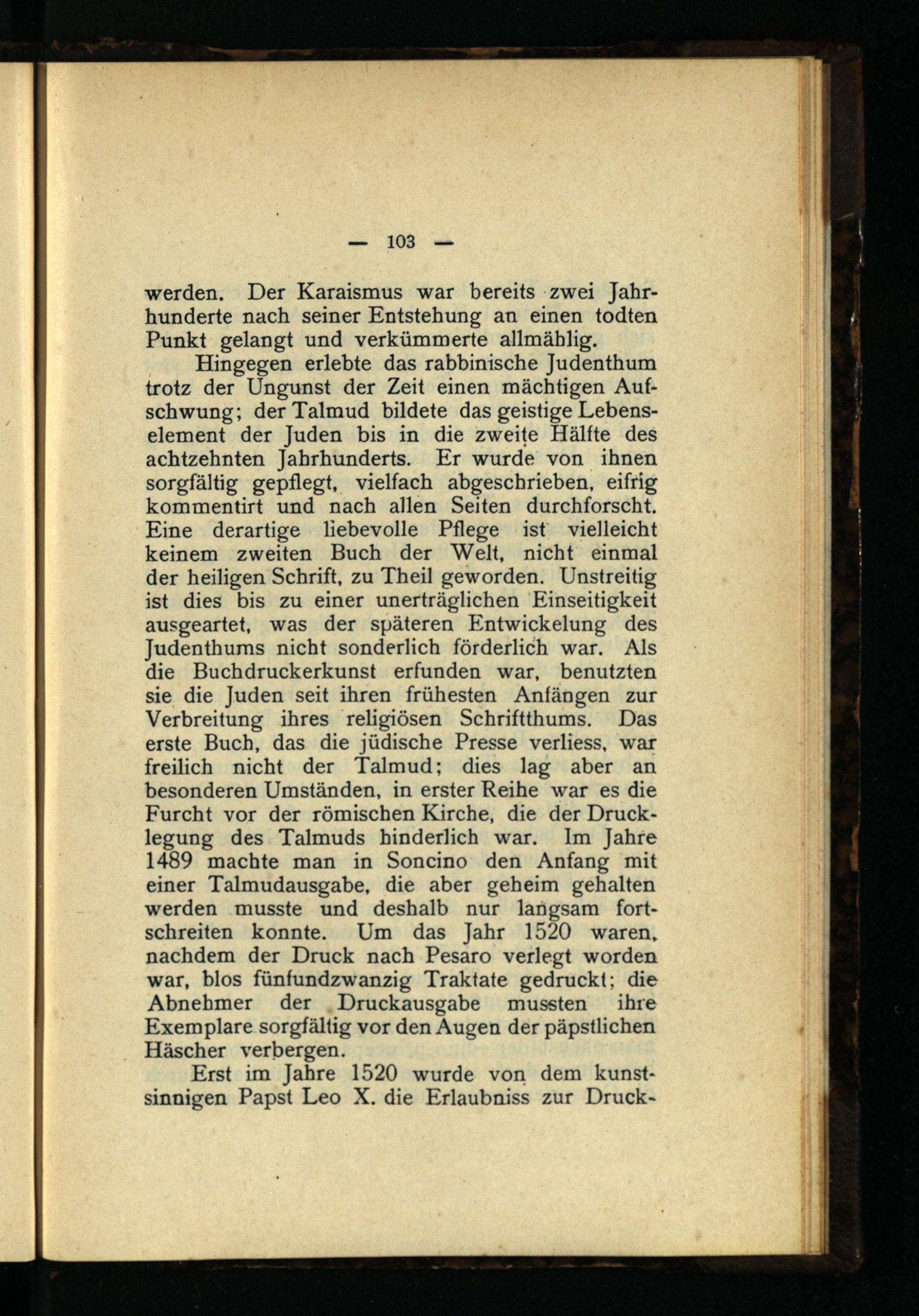 Hingegen erlebte das rabbinische Judenthum trotz der Ungunst der Zeit einen mächtigen Aufschwung; der Talmud bildete das geistige Lebenselement der Juden bis in die zweite Hälfte des achtzehnten Jahrhunderts. Er wurde von ihnen sorgfältig gepflegt, vielfach abgeschrieben, eifrig kommentirt und nach allen Seiten durchforscht. Eine derartige liebevolle Pflege ist vielleicht keinem zweiten Buch der Welt, nicht einmal der heiligen Schrift, zu Theil geworden. Unstreitig ist dies bis zu einer unerträglichen Einseitigkeit ausgeartet, was der späteren Entwickelung des Judenthums nicht sonderlich förderlich war. Als die Buchdruckerkunst erfunden war, benutzten sie die Juden seit ihren frühesten Anfängen zur Verbreitung ihres religiösen Schriftthums. Das erste Buch, das die jüdische Presse verliess, war freilich nicht der Talmud; dies lag aber an besonderen Umständen, in erster Reihe war es die Furcht vor der römischen Kirche, die der Drucklegung des Talmuds hinderlich war. Im Jahre 1489 machte man in Soncino den Anfang mit einer Talmudausgabe, die aber geheim gehalten werden musste und deshalb nur langsam fortschreiten konnte. Um das Jahr 1520 waren, nachdem der Druck nach Pesaro verlegt worden war, blos fünfundzwanzig Traktate gedruckt; die Abnehmer der Druckausgabe mussten ihre Exemplare sorgfältig vor den Augen der päpstlichen Häscher verbergen.