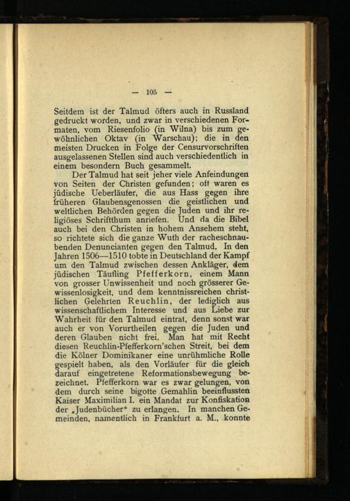 Der Talmud hat seit jeher viele Anfeindungen von Seiten der Christen gefunden; oft waren es jüdische Ueberläufer, die aus Hass gegen ihre früheren Glaubensgenossen die geistlichen und weltlichen Behörden gegen die Juden und ihr religiöses Schriftthum anriefen. Und da die Bibel auch bei den Christen in hohem Ansehem steht, so richtete sich die ganze Wuth der racheschnaubenden Denuncianten gegen den Talmud. In den Jahren 1506—1510 tobte in Deutschland der Kampf um den Talmud zwischen dessen Ankläger, dem jüdischen Täufling Pfefferkorn, einem Mann von grosser Unwissenheit und noch grösserer Gewissenlosigkeit, und dem kenntnisreichen christlichen Gelehrten Reuchlin, der lediglich aus wissenschaftlichem Interesse und aus Liebe zur Wahrheit für den Talmud eintrat, denn sonst war auch er von Vorurtheilen gegen die Juden und deren Glauben nicht frei. Man hat mit Recht diesen Reuchlin-Pfefferkorn’schen Streit, bei dem die Kölner Dominikaner eine unrühmliche Rolle gespielt haben, als den Vorläufer für die gleich darauf eingetretene Reformationsbewegung bezeichnet. Pfefferkorn war es zwar gelungen, von dem durch seine bigotte Gemahlin beeinflussten Kaiser Maximilian I. ein Mandat zur Konfiskation der „Judenbücher* zu erlangen. In manchen Gemeinden, namentlich in Frankfurt a. M., konnte