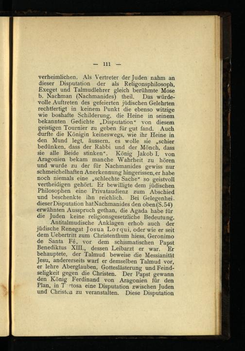 verheimlichen. Als Vertreter der Juden nahm an dieser Disputation der als Religonsphilosoph, Exeget und Talmudlehrer gleich berühmte Mose b. Nachm an (Nachmanides) theil. Das würdevolle Auftreten des gefeierten jüdischen Gelehrten rechtfertigt in keinem Punkt die ebenso witzige wie boshafte Schilderung, die Heine in seinem bekannten Gedichte „Disputation“ von diesem geistigen Tournier zu geben für gut fand. Auch durfte die Königin keineswegs, wie ihr Heine in den Mund legt, äussern, es wolle sie „schier bedünken, dass der Rabbi und der Mönch, dass sie alle Beide stinken“. König Jakob I. von Aragonien bekam manche Wahrheit zu hören und wurde zu der für Nachmanides gewiss nur schmeichelhaften Anerkennung hingerissen, er habe noch niemals eine „schlechte Sache“ so geistvoll vertheidigen gehört. Er bewilligte dem jüdischen Philosophen eine Privataudienz zum Abschied und beschenkte ihn reichlich. Bei Gelegenhei- dieser Disputation hat Nachmanides den oben(S.54) erwähnten Ausspnich gethan, die Agada habe für die Juden keine religionsgesetzliche Bedeutung.