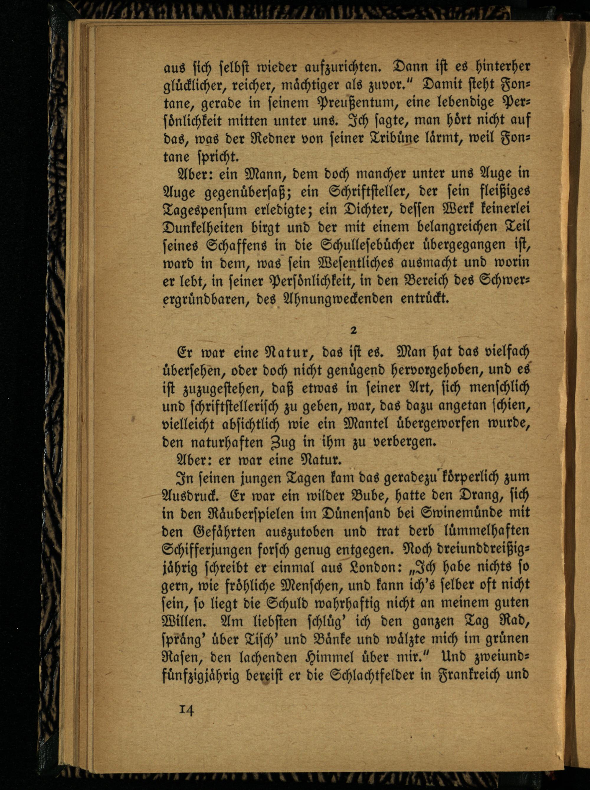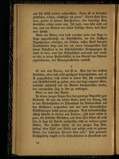 aus sich selbst wieder auszurichten. Dann ist es hinterher glücklicher, reicher, mächtiger als zuvor." Damit steht Fontane, gerade in seinem Preußentum, eine lebendige Persönlichkeit mitten unter uns. Ich sagte, man hört nicht auf das, was der Redner von seiner Tribüne lärmt, weil Fontane spricht.