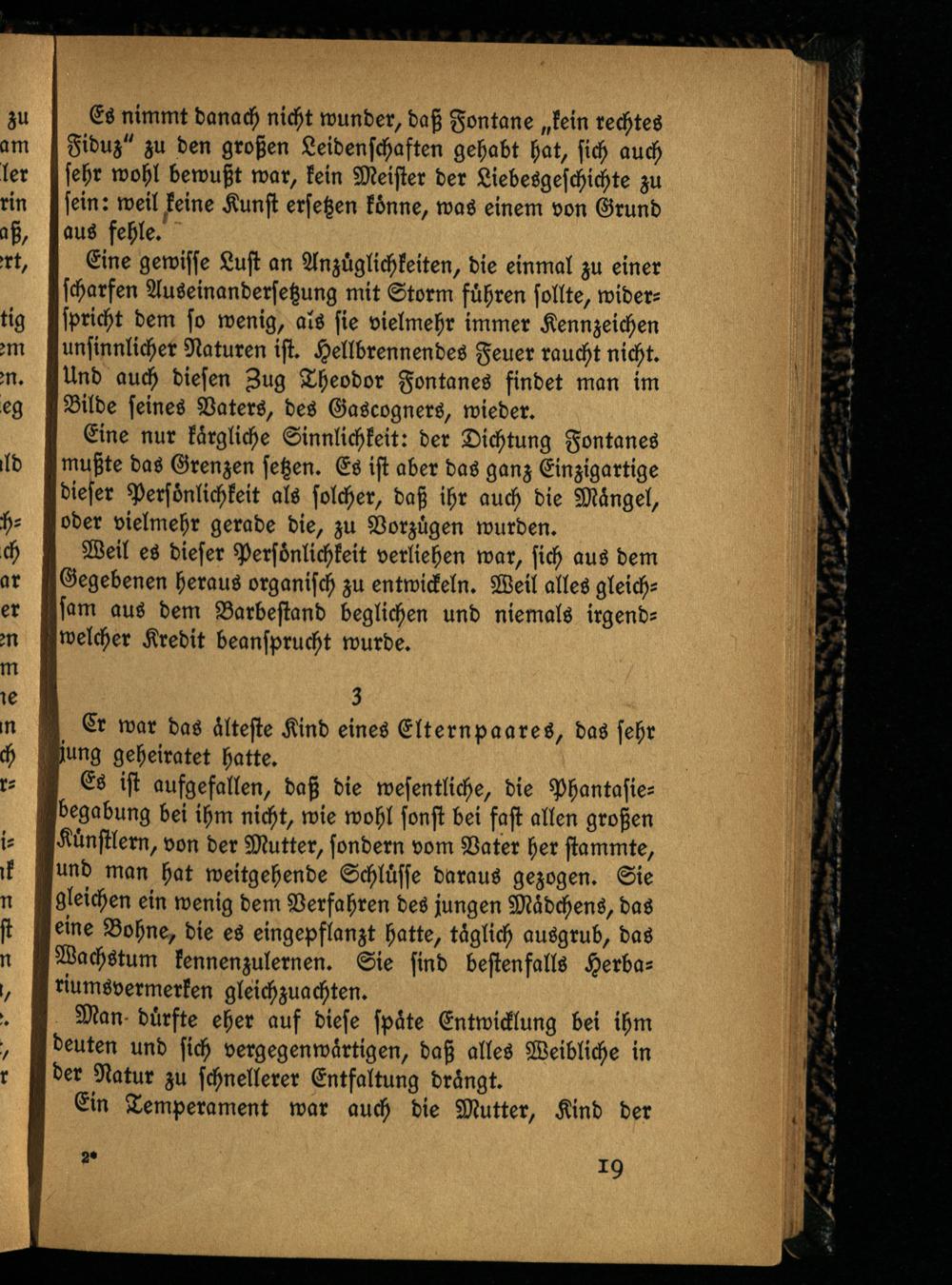 Eine gewisse Lust an Anzüglichkeiten, die einmal zu einer scharfen Auseinandersetzung mit Storm führen sollte, widerspricht dem so wenig, als sie vielmehr immer Kennzeichen unsinnlicher Naturen ist. Hellbrennendes Feuer raucht nicht. Und auch diesen Zug Theodor Fontanes findet man im Bilde seines Vaters, des Gascogners, wieder.