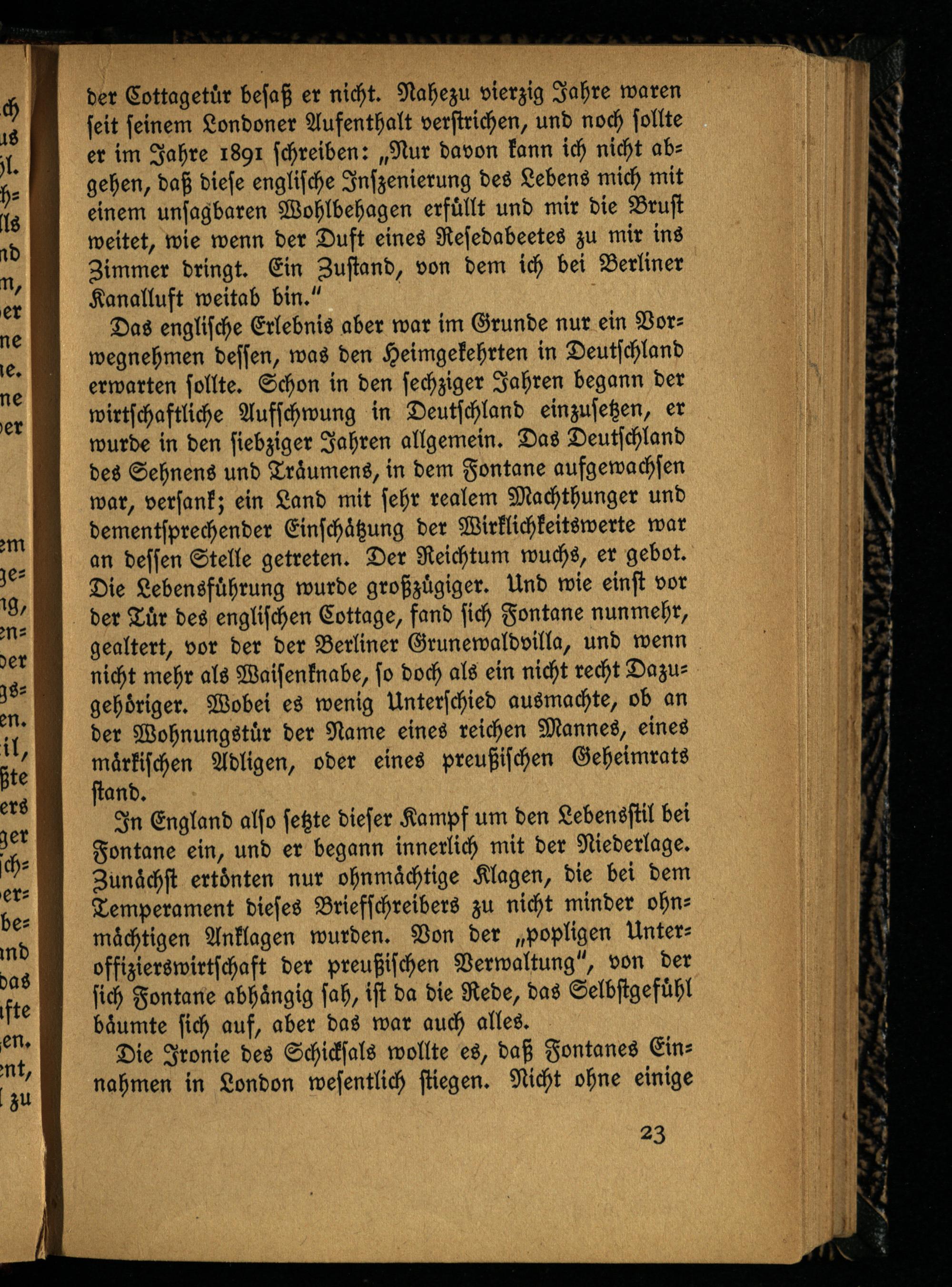 Das englische Erlebnis aber war im Grunde nur ein Vorwegnehmen dessen, was den Heimgekehrten in Deutschland erwarten sollte. Schon in den sechziger Jahren begann der wirtschaftliche Aufschwung in Deutschland einzusetzen, er wurde in den siebziger Jahren allgemein. Das Deutschland des Sehnens und Träumens, in dem Fontane aufgewachsen war, versank; ein Land mit sehr realem Machthunger und dementsprechender Einschätzung der Wirklichkeitswerte war an dessen Stelle getreten. Der Reichtum wuchs, er gebot. Die Lebensführung wurde großzügiger. Und wie einst vor der Tür des englischen Cottage, fand sich Fontane nunmehr, gealtert, vor der der Berliner Grunewaldvilla, und wenn nicht mehr als Waisenknabe, so doch als ein nicht recht Dazugehöriger. Wobei es wenig Unterschied ausmachte, ob an der Wohnungstür der Name eines reichen Mannes, eines märkischen Adligen, oder eines preußischen Geheimrats stand.