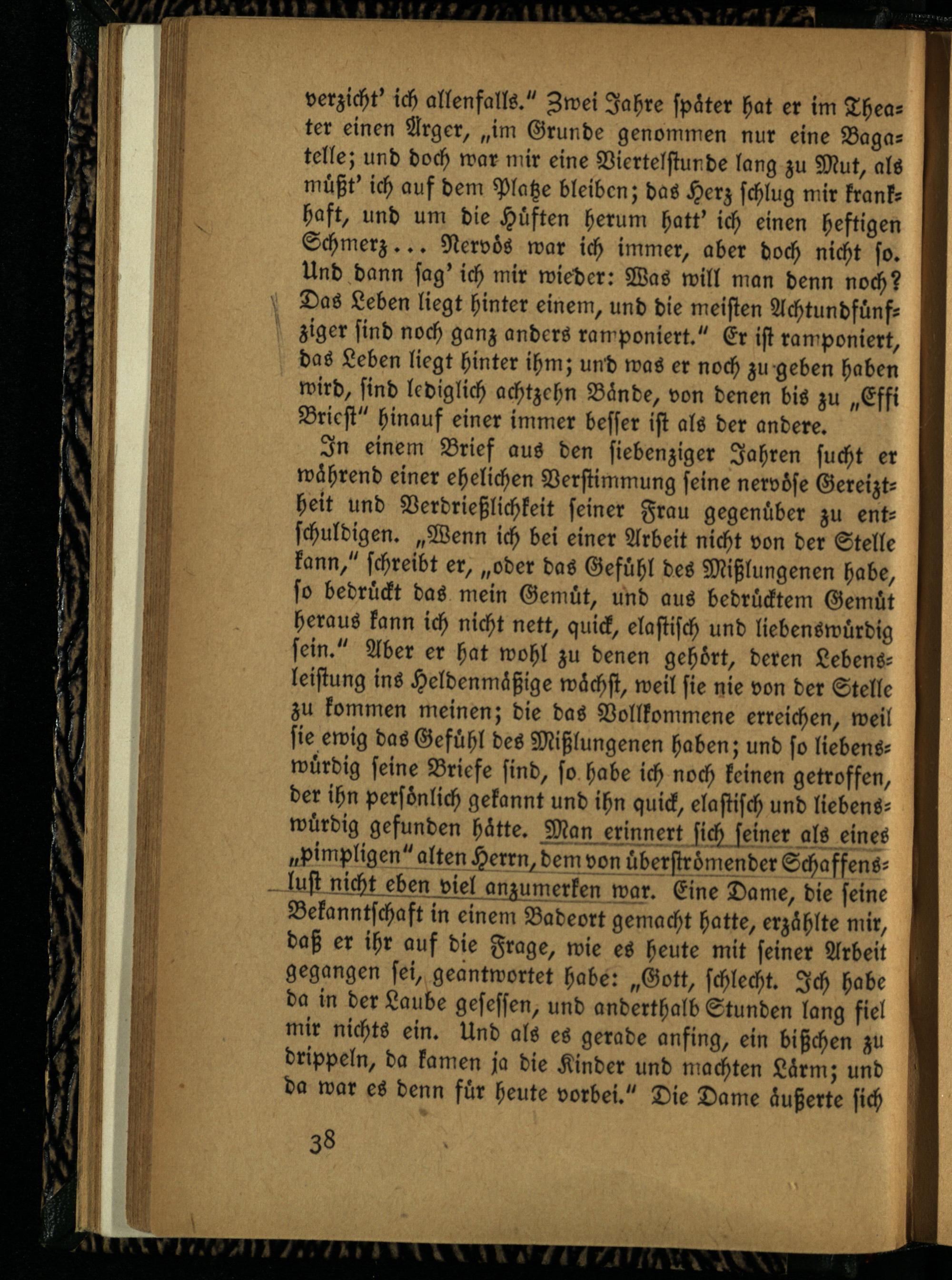 In einem Brief aus den siebenziger Jahren sucht er während einer ehelichen Verstimmung seine nervöse Gereiztheit und Verdrießlichkeit seiner Frau gegenüber zu entschuldigen. „Wenn ich bei einer Arbeit nicht von der Stelle kann," schreibt er, „oder das Gefühl des Mißlungenen habe, so bedrückt das mein Gemüt, und aus bedrücktem Gemüt heraus kann ich nicht nett, quick, elastisch und liebenswürdig sein." Aber er hat wohl zu denen gehört, deren LebenS- leistung ins Heldenmäßige wächst, weil sie nie von der Stelle zu kommen meinen; die das Vollkommene erreichen, weil sie ewig das Gefühl des Mißlungenen haben; und so liebenswürdig seine Briefe sind, so habe ich noch keinen getroffen, der ihn persönlich gekannt und ihn quick, elastisch und liebenswürdig gefunden hätte. Man erinnert si ch se iner als eines „pimpligen" alten He rrn, dem von ü berströmender SchaffenS- - lust nicht eben viel anrume rken war. Eine Dame, die seine Bekanntschaft in einem Badeort gemacht hatte, erzählte niir, daß er ihr auf die Frage, wie es heute mit seiner Arbeit gegangen sei, geantwortet habe: „Gott, schlecht. Ich habe da in der Laube gesessen, und anderthalb Stunden lang fiel mir nichts ein. Und als es gerade anfing, ein bißchen zu drippeln, da kamen ja die Kinder und machten Lärm; und da war es denn für heute vorbei." Die Dame äußerte sich