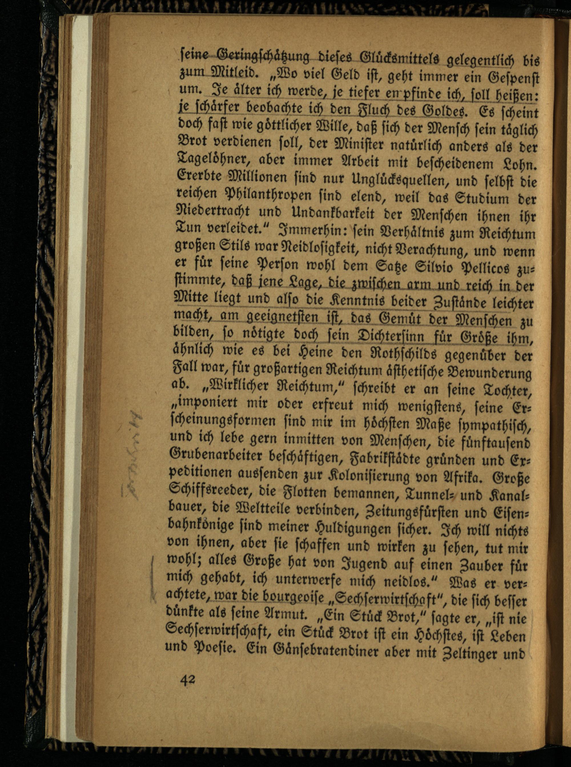 sein« Ge r i ngsch ätzung dieses Glücksmittels gelegentlich bis zum Mitleid. „Wo viel Geld ist, geht immer ein Gespenst um. Je älter ich werde, je tiefer empfinde i ch, so ll heißen: j e schä rfer beobachte ich den Fluch des Goldes. Es scheint doch fast wie göttlicher Wille, daß sich der Mensch sein täglich Brot verdienen soll, der Minister natürlich anders als der Tagelöhner, aber immer Arbeit mit bescheidenem Lohn. Ererbte Millionen sind nur Unglücksquellen, und selbst die reichen Philanthropen sind elend, weil das Studium der Niedertracht und Undankbarkeit der Menschen ihnen ihr Tun verleidet." Immerhin: sein Verhältnis zum Reichtum großen Stils war Neidlosigkeit, nicht Verachtung, und wenn er für seine Person wohl dem Satze Silvio Pellicos zustimmte, daß jene Lage, die znrischLL.Lrlli.mnd reich in der Mitte liegt und also die Kenntnis beider Zustände leichter mach t, am geeignetsten ist, das Gemüt der Menschen zu bilden, so nötigte doch sein Dichte rsinn fü r Größe ihm, ähnlich wie es bei Heine den Rothschilds gegenüber der Fall war, für großartigen Reichtum ästhetische Bewunderung ab. „Wirklicher Reichtum," schreibt er an seine Tochter, „imponiert niir oder erfreut mich wenigstens, seine Erscheinungsformen sind mir im höchsten Maße sympathisch, und ich lebe gern inmitten von Menschen, die fünftausend Grubenarbeiter beschäftigen, Fabrikstädte gründen und Expeditionen aussenden zur Kolonisierung von Afrika. Große Schiffsreeder, die Flotten bemannen, Tunnel- und Kanalbauer, die Weltteile verbinden, Jeitungsfürsten und Eisenbahnkönige sind meiner Huldigungen sicher. Ich will nichts von ihnen, aber sie schaffen und wirken zu sehen, tut niir wohl; alles Große hat von Jugend auf einen Zauber für mich gehabt, ich unterwerfe mich neidlos." Was er verachtete, war die bourgeoise „Sechserwirtschaft", die sich besser dünkte als seine Armut. „Ein Stück Brot," sagte er, „ist nie Sechserwirtschaft, ein Stück Brot ist ein Höchstes, ist Leben und Poesie. Ein Gänsebratendiner aber mit Jeltinger und