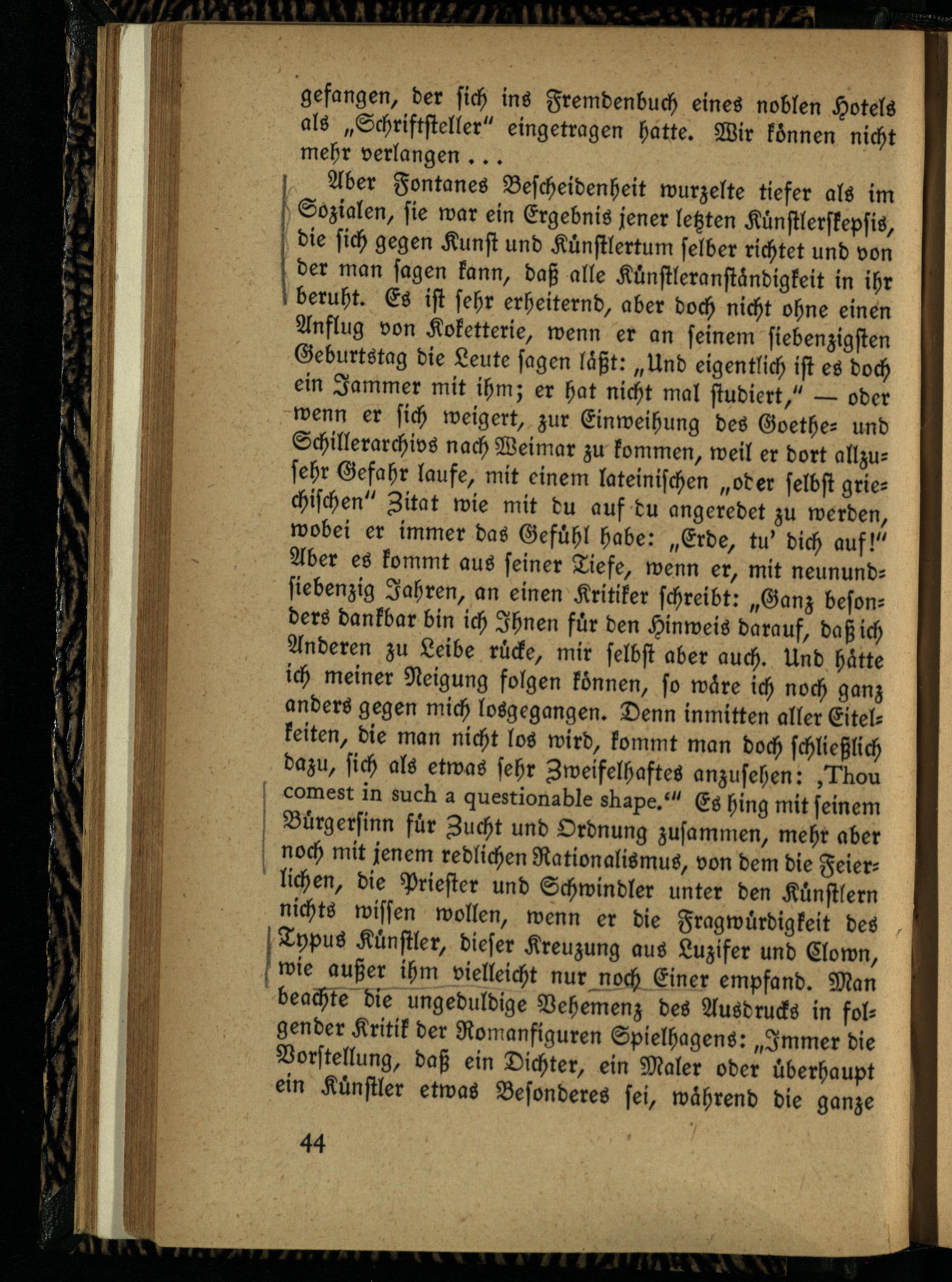 Aber Fontanes Bescheidenheit wurzelte tiefer als im Sozialen, sie war ein Ergebnis jener letzten Künstlerskepsis, die sich gegen Kunst und Künstlertum selber richtet und von der man sagen kann, daß alle Künstleranständigkeit in ihr beruht. Es ist sehr erheiternd, aber doch nicht ohne einen Anflug von Koketterie, wenn er an seinem siebenzigsten Geburtstag die Leute sagen läßt: „Und eigentlich ist es doch ein Jammer mit ihm; er hat nicht mal studiert," — oder wenn er sich weigert, zur Einweihung des Goethe- und Schillerarchivs nach Weimar zu kommen, weil er dort allzusehr Gefahr laufe, mit einem lateinischen „oder selbst griechischen" Zitat wie mit du auf du angeredet zu werden, wobei er immer das Gefühl habe: „Erde, tu' dich auf!" Aber es kommt aus seiner Tiefe, wenn er, mit neunund- siebenzig Jahren, an einen Kritiker schreibt: „Ganz besonders dankbar bin ich Ihnen für den Hinweis darauf, daß ich Anderen zu Leibe rücke, mir selbst aber auch. Und hätte ich meiner Neigung folgen können, so wäre ich noch ganz anders gegen mich losgegangen. Denn inmitten aller Eitelkeiten, die man nicht los wird, kommt man doch schließlich dazu, sich als etwas sehr Zweifelhaftes anzusehen: ,T°ticiu comesr in suctt a guesrionsble sdape?" Es hing mit seinem Bürgersinn für Zucht und Ordnung zusammen, mehr aber noch mit jenem redlichen Rationalismus, von dem die Feier- ^ liehen, die Priester und Schwindler unter den Künstlern nichts wissen wollen, wenn er die Fragwürdigkeit des l Typus Künstler, dieser Kreuzung aus Luzifer und Clown, k wie außer ihm vielleicht nur noch Einer empfand. Man beachte die ungeduldige Vehemenz des Ausdrucks in folgender Kritik der Romanfiguren Spielhagens: „Immer die Vorstellung, daß ein Dichter, ein Maler oder überhaupt ein Künstler etwas Besonderes sei, während die ganze