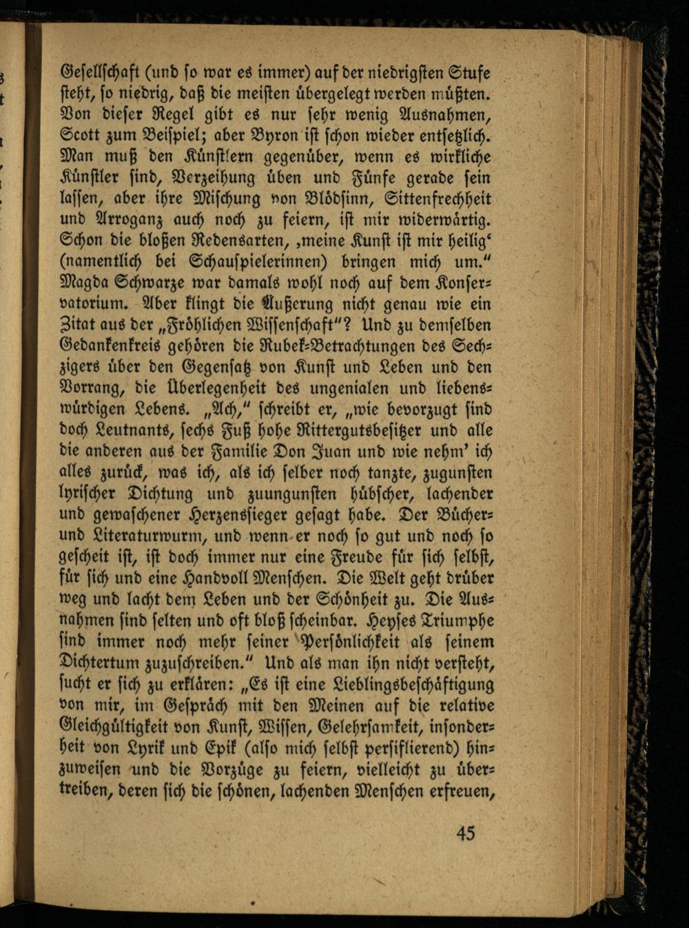 Gesellschaft (und so war es immer) auf der niedrigsten Stufe steht, so niedrig, daß die meisten übergelegt werden müßten. Von dieser Regel gibt es nur sehr wenig Ausnahmen, Scott zum Beispiel; aber Byron ist schon wieder entsetzlich. Man muß den Künstlern gegenüber, wenn eS wirkliche Künstler sind, Verzeihung üben und Fünfe gerade sein lassen, aber ihre Mischung non Blödsinn, Sittenfrechheit und Arroganz auch noch zu feiern, ist mir widerwärtig. Schon die bloßen Redensarten, .meine Kunst ist mir heilig' (namentlich bei Schauspielerinnen) bringen mich um." Mazda Schwarze war damals wohl noch auf dem Konservatorium. Aber klingt die Äußerung nicht genau wie ein Aitat aus der „Fröhlichen Wissenschaft"? Und zu demselben Gedankenkreis gehören die Rubek-Betrachtungen des Sechzigers über den Gegensatz von Kunst und Leben und den Vorrang, die Überlegenheit des ungenialen und liebenswürdigen Lebens. „Ach," schreibt er, „wie bevorzugt sind doch Leutnants, sechs Fuß hohe Rittergutsbesitzer und alle die anderen aus der Familie Don Juan und wie nehm' ich alles zurück, was ich, als ich selber noch tanzte, zugunsten lyrischer Dichtung und zuungunsten hübscher, lachender und gewaschener Herzenssieger gesagt habe. Der Bücherund Literaturwurm, und wenn er noch so gut und noch so gescheit ist, ist doch immer nur eine Freude für sich selbst, für sich und eine Handvoll Menschen. Die Welt geht drüber weg und lacht dem Leben und der Schönheit zu. Die Ausnahmen sind selten und oft bloß scheinbar. Heyses Triumphe sind immer noch mehr seiner Persönlichkeit als seinem Dichtertum zuzuschreiben." Und als man ihn nicht versteht, sucht er sich zu erklären: „Es ist eine Lieblingsbeschäftigung von mir, im Gespräch mit den Meinen auf die relative Gleichgültigkeit von Kunst, Wissen, Gelehrsamkeit, insonderheit von Lyrik und Epik (also mich selbst persiflierend) hinzuweisen und die Vorzüge zu feiern, vielleicht zu übertreiben, deren sich die schönen, lachenden Menschen erfreuen.