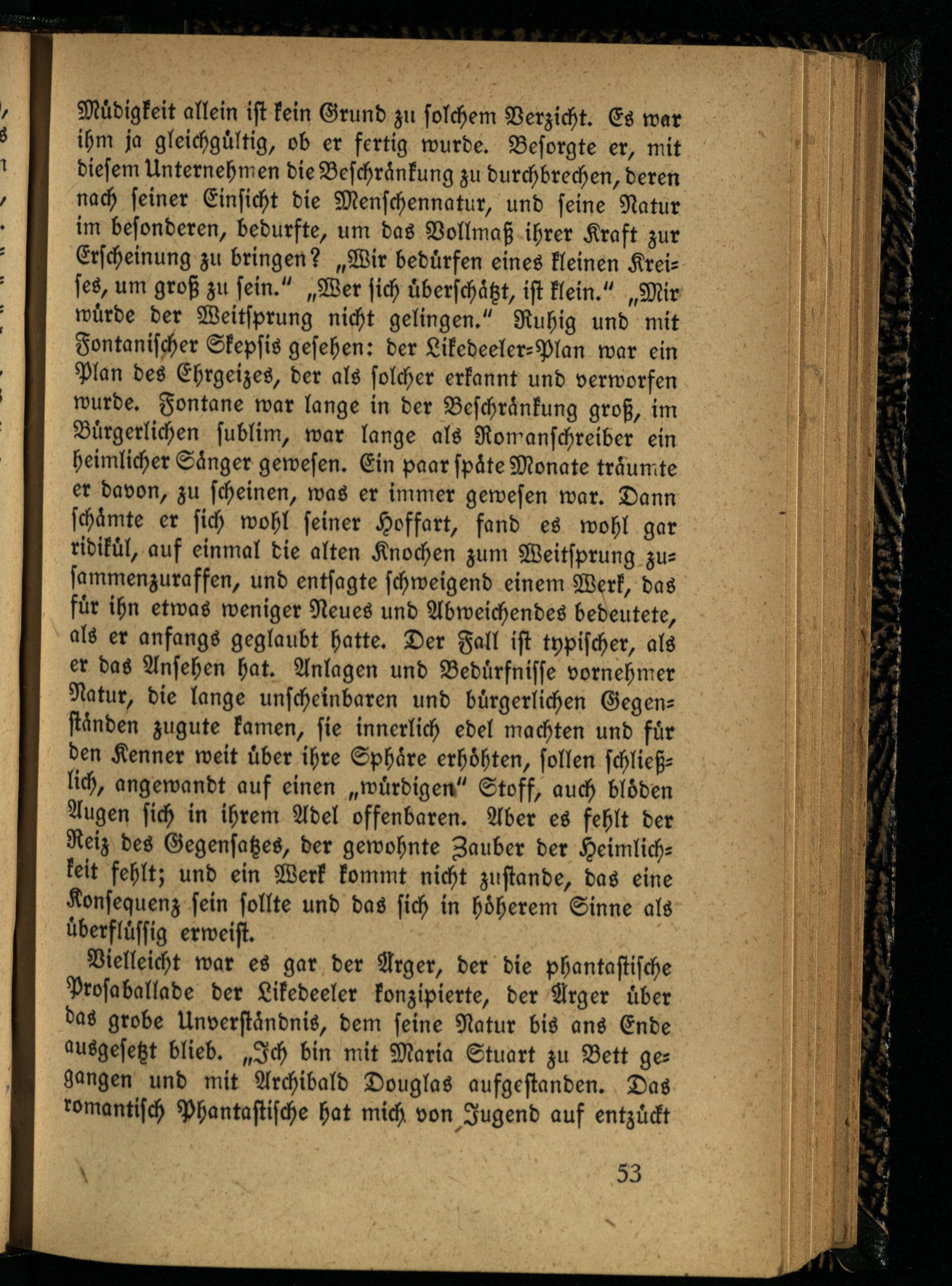 Müdigkeit allein ist kein Grund zu solchem Verzicht. Es war ihm ja gleichgültig, ob er fertig wurde. Besorgte er, mit diesem Unternehmen die Beschränkung zu durchbrechen, deren nach seiner Einsicht die Menschennatur, und seine Natur im besonderen, bedurfte, um das Vollmaß ihrer Kraft zur Erscheinung zu bringen? „Wir bedürfen eines kleinen Kreises, um groß zu sein." „Wer sich überschätzt, ist klein." „Mir würde der Weitsprung nicht gelingen." Ruhig und mit Fontanischer Skepsis gesehen: der Likedeeler-Plan war ein Plan des Ehrgeizes, der als solcher erkannt und verworfen wurde. Fontane war lange in der Beschränkung groß, im Bürgerlichen sublim, war lange als Romanschreiber ein heimlicher Sänger gewesen. Ein paar späte Monate träumte er davon, zu scheinen, was er immer gewesen war. Dann schämte er sich wohl seiner Hoffart, fand es wohl gar ridikül, auf einmal die alten Knochen zun, Weitsprung zusammenzuraffen, und entsagte schweigend einem Werk, das für ihn etwas weniger Neues und Abweichendes bedeutete, als er anfangs geglaubt hatte. Der Fall ist typischer, als er das Ansehen hat. Anlagen und Bedürfnisse vornehmer Natur, die lange unscheinbaren und bürgerlichen Gegenständen zugute kamen, sie innerlich edel machten und für den Kenner weit über ihre Sphäre erhöhten, sollen schließlich, angewandt auf einen „würdigen" Stoff, auch blöden Augen sich in ihrem Adel offenbaren. Aber es fehlt der Reiz des Gegensatzes, der gewohnte Zauber der Heimlichkeit fehlt; und ein Werk kommt nicht zustande, das eine Konsequenz sein sollte und das sich in höherem Sinne als überflüssig erweist.